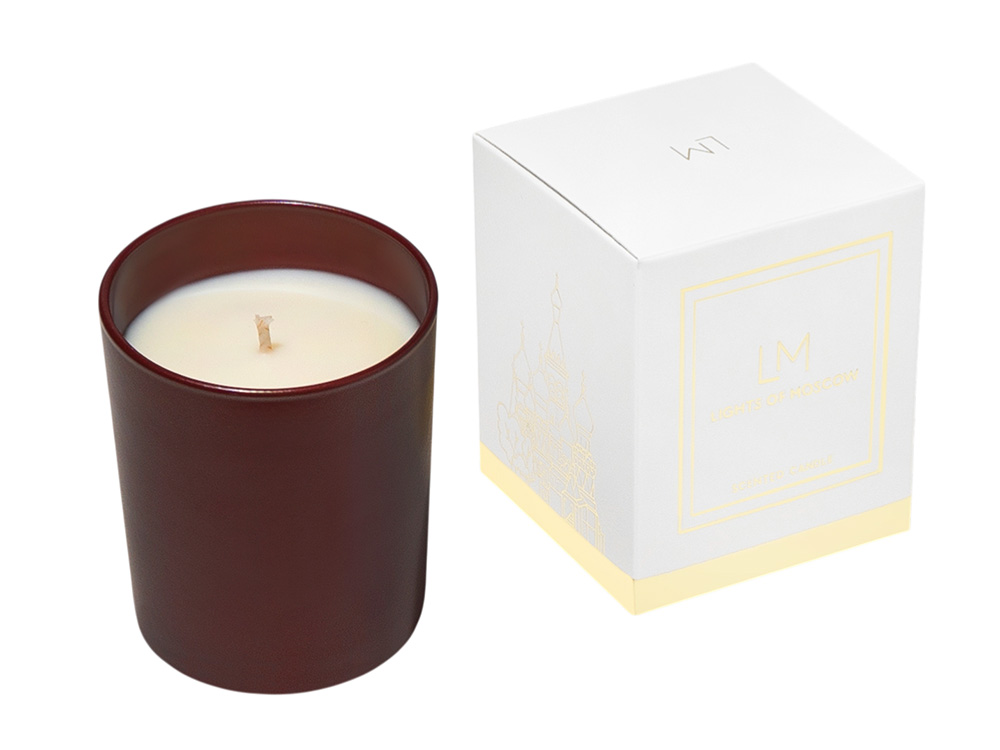 Коллекция аромасвечей “Exclusive” является уникальной не только из-за ароматов коллекции, но и благодаря тщательно разработанному дизайну упаковки, которая является напоминанием о том, что бренд Lights of Moscow — это ручное российское производство в самом центре Москвы. Белая коробка оформлена ярким золотым фольгированием, на левой стороне которой изображен Храм Василия Блаженного — одна из главных достопримечательностей на Красной площади в Москве.