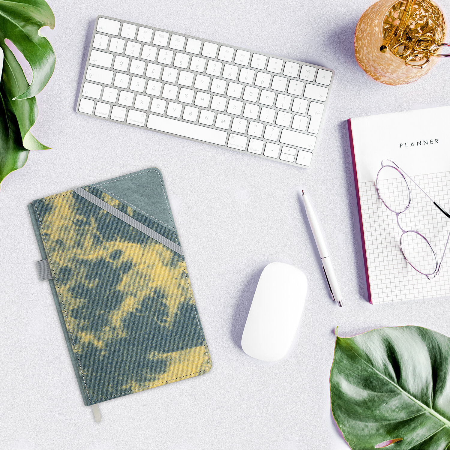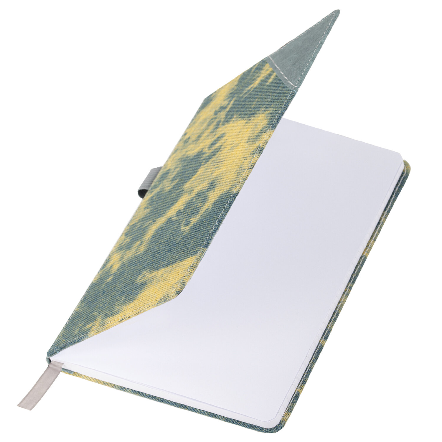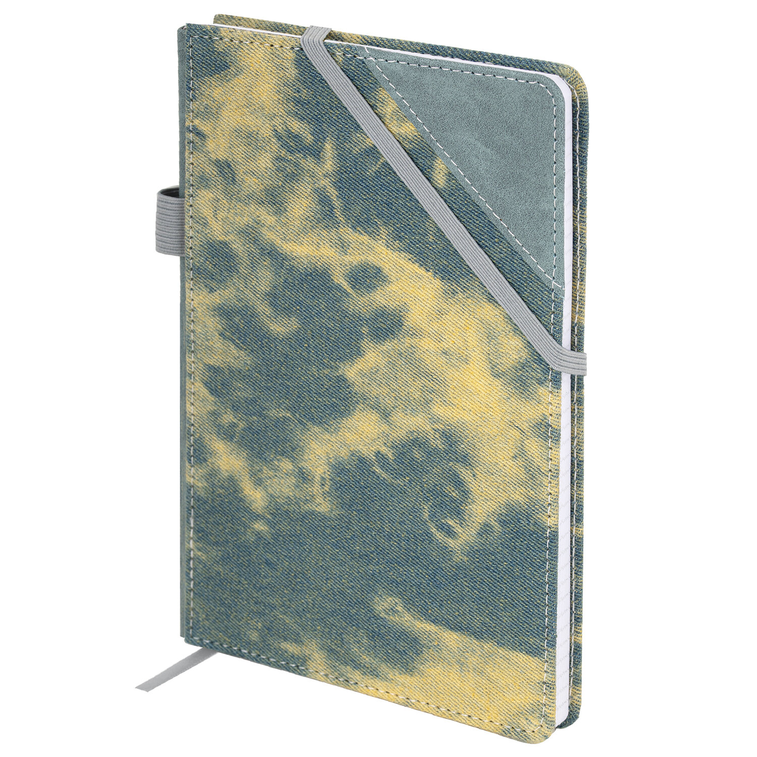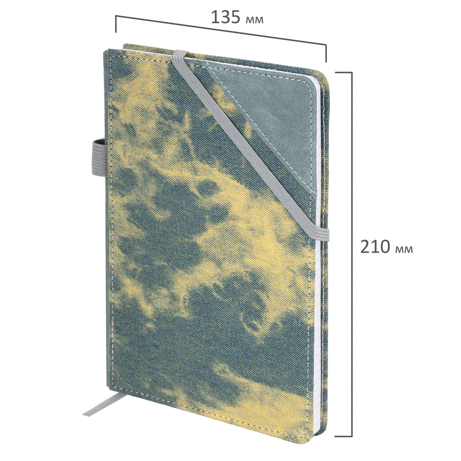 Твердая обложка изготовлена из джинсовой ткани с отделкой под кожу, что придает ежедневнику оригинальный вид. Имеет закругленные уголки. 80 листов позволят зафиксировать большой объем информации. Линовка блока в клетку (5х5 мм) дает возможность аккуратно заполнить цифровые значения, а также нанести чертежные зарисовки. Внутренний блок выполнен из офсета белого цвета плотностью 70 г/м2. Снабжен резинкой-фиксатором, благодаря чему блокнот не откроется в сумочке или портфеле, и листы не помнутся. Дополнением является закладка-ляссе, с помощью которой при необходимости можно быстро открыть нужную страницу, а также держатель для ручки, повышающий функциональность блокнота. Формат А5 (135х210 мм) позволит владельцу поместить его в кейс или сумку малых габаритов.