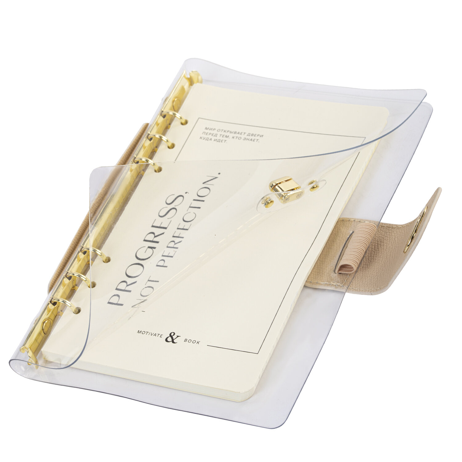Бизнес-блокнот имеет гибкую прозрачную пластиковую обложку и золотистые детали, что придает ему стильный и оригинальный вид. Имеет закругленные уголки. 80 листов позволят зафиксировать большой объем информации. Линовка блока в клетку (5х5 мм) дает возможность аккуратно заполнить цифровые значения, а также нанести чертежные зарисовки. Внутренний блок выполнен из офсета кремового цвета плотностью 70 г/м2. Снабжен застежкой с поворотным механизмом, благодаря чему блокнот не откроется в сумочке или портфеле, и листы не помнутся. Формат А5 (180х235 мм) позволит владельцу поместить его в кейс или сумку малых габаритов.