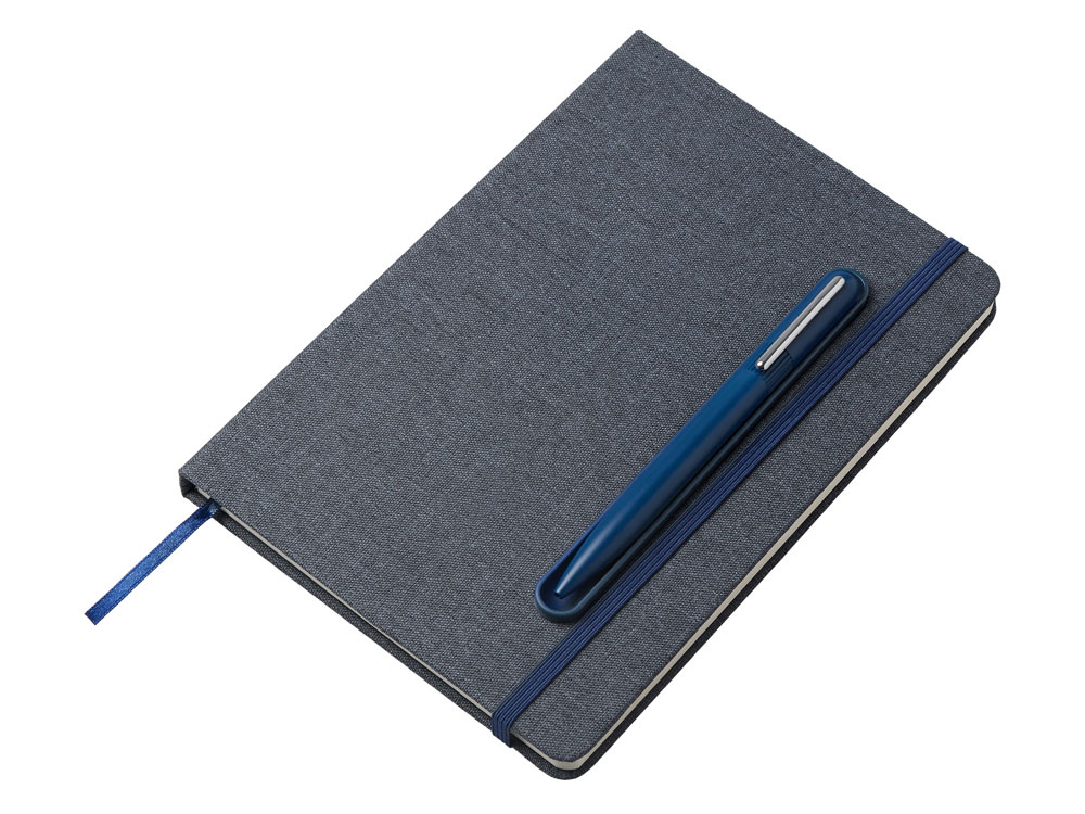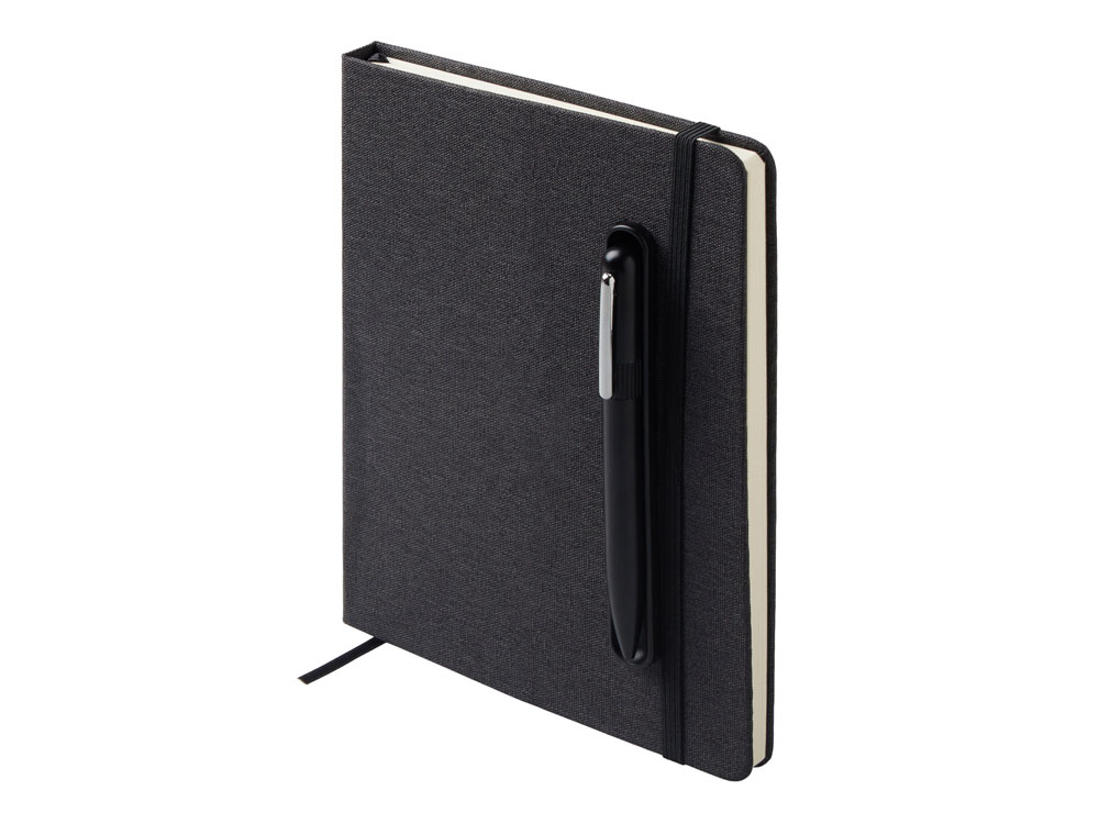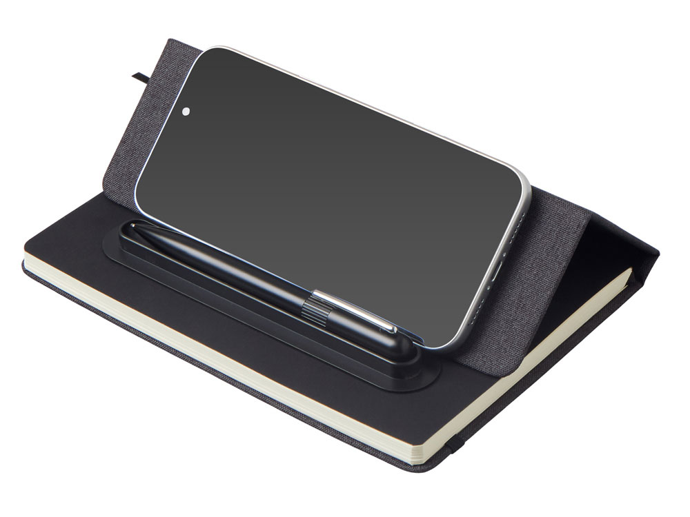 Блокнот в твердой обложке из rpet-пластика с металлической шариковой ручкой. В обложке магнитный держатель для ручки. Также верхняя часть обложки трансформируется в подставку для телефона.