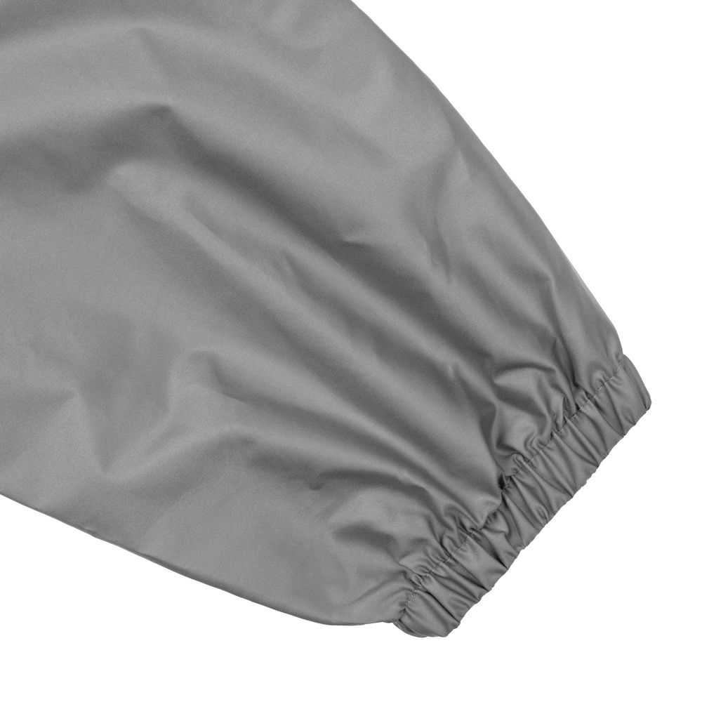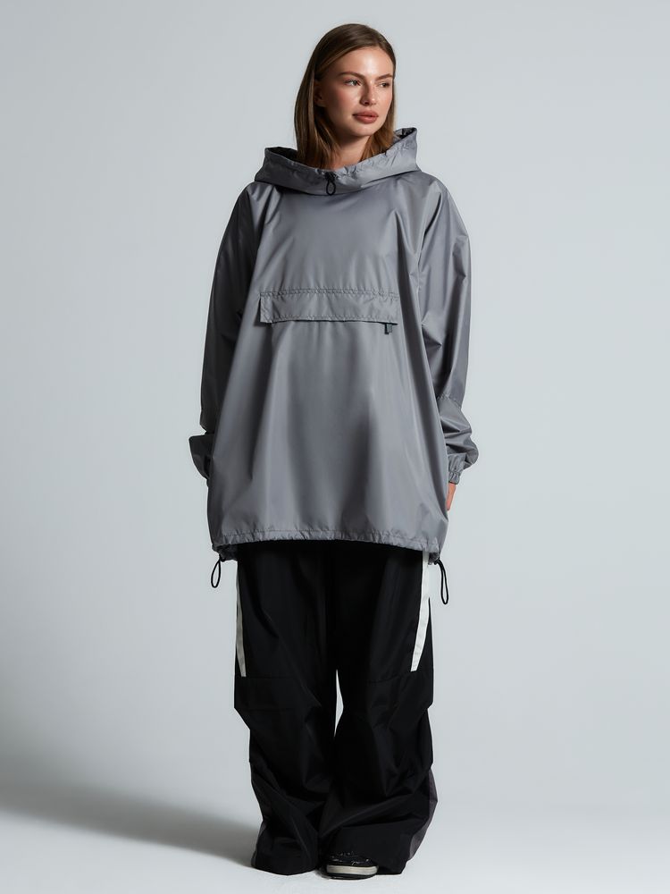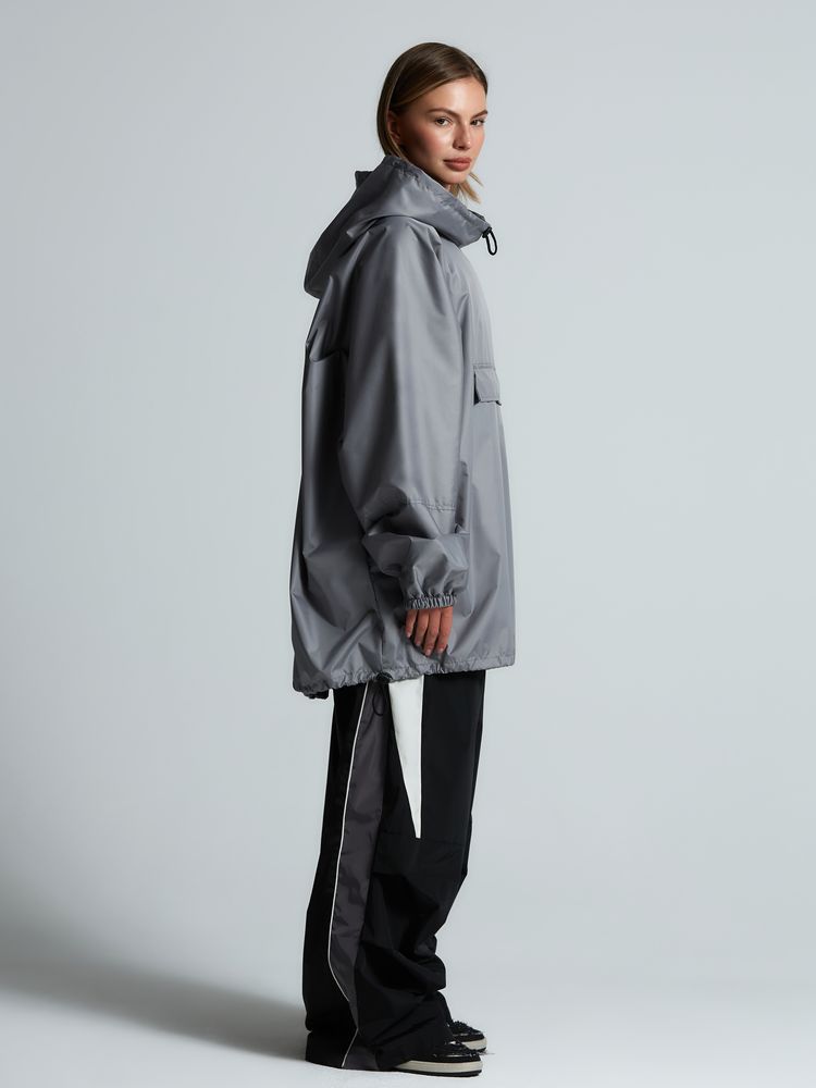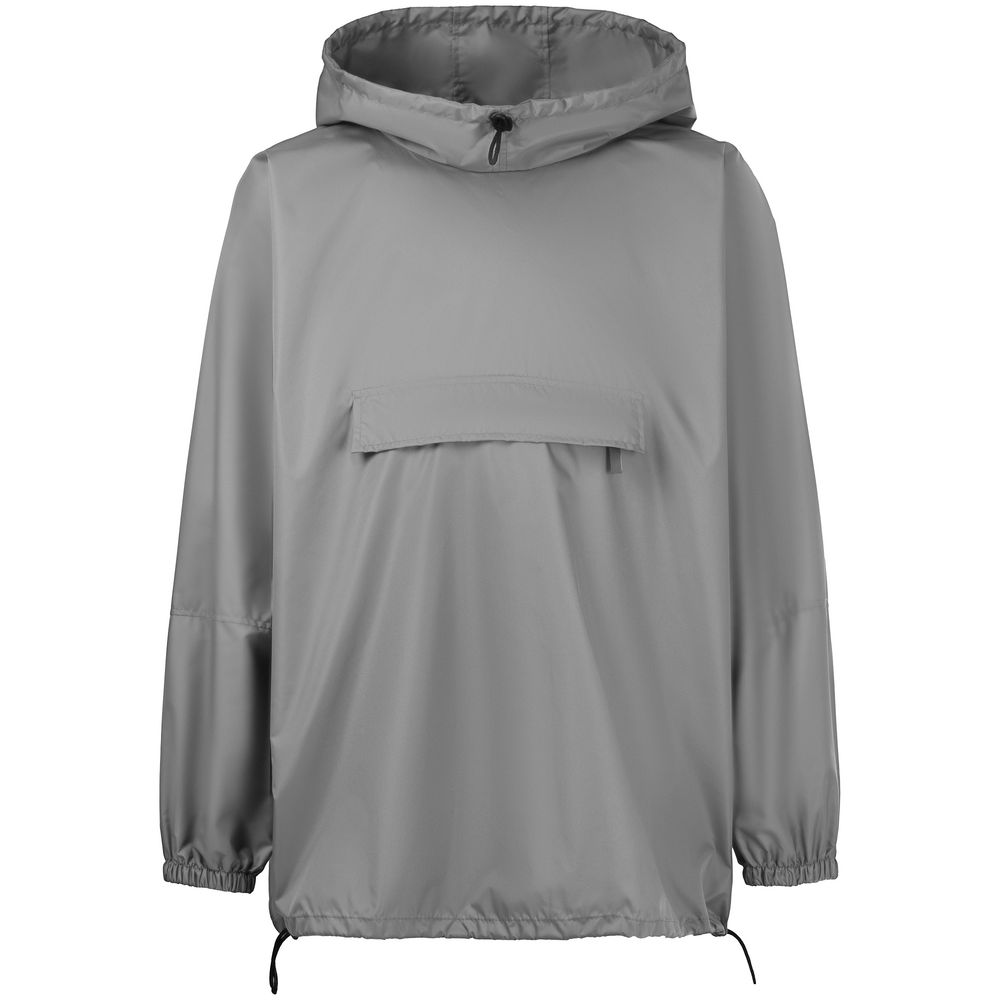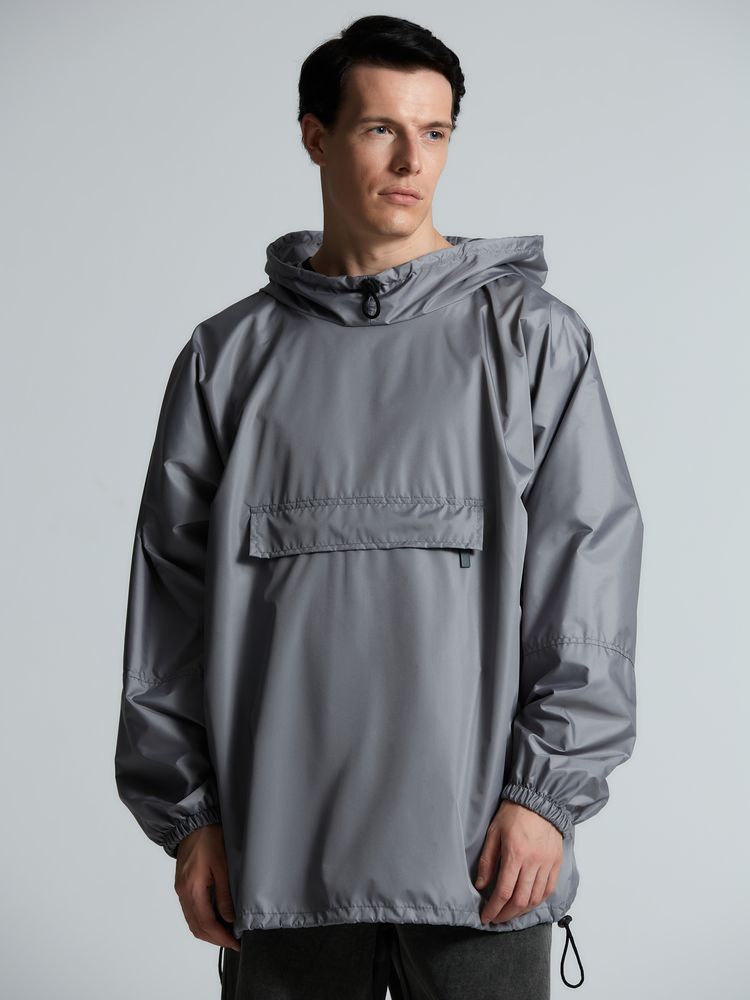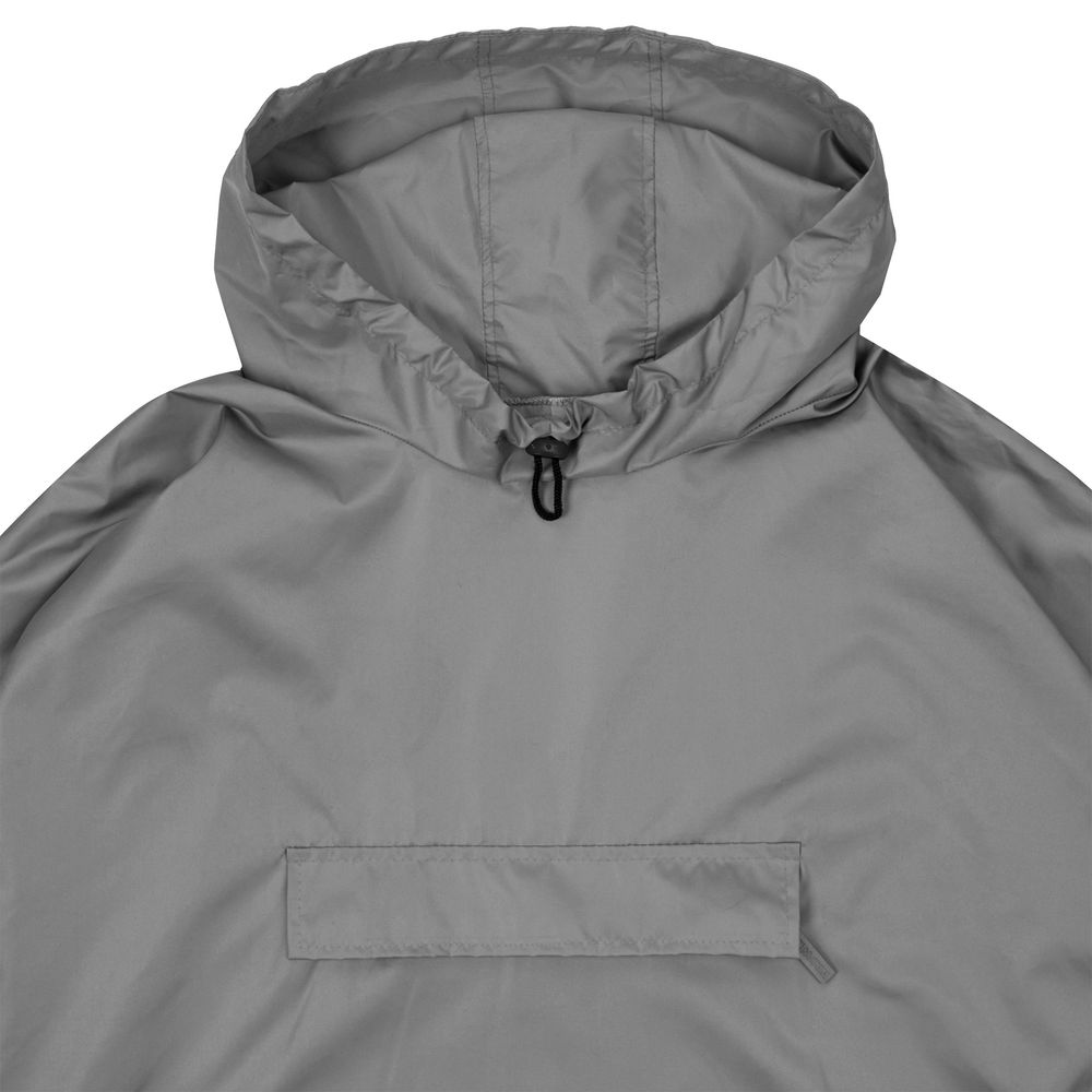 Дождевик-анорак с капюшоном и карманом на молнии спереди. Выполнен из ткани дюспо с матовой поверхностью — легкой, мягкой на ощупь, но устойчивой к повреждениям. Она не шелестит и практически не мнется. Благодаря пропитке дюспо обладает отличными водоотталкивающими и ветрозащитными свойствами.