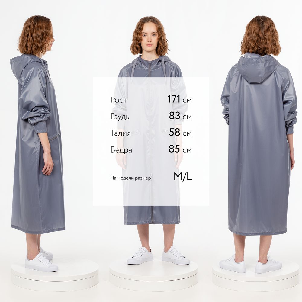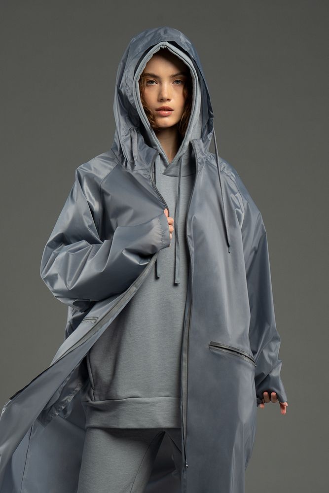 Плащ-дождевик на молнии с капюшоном из ткани таффета с полиуретановой пропиткой для защиты от сильного дождя.
