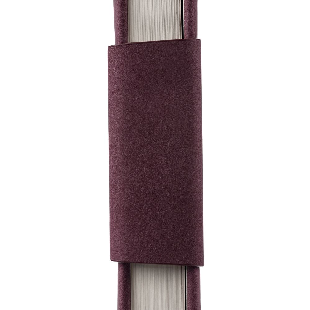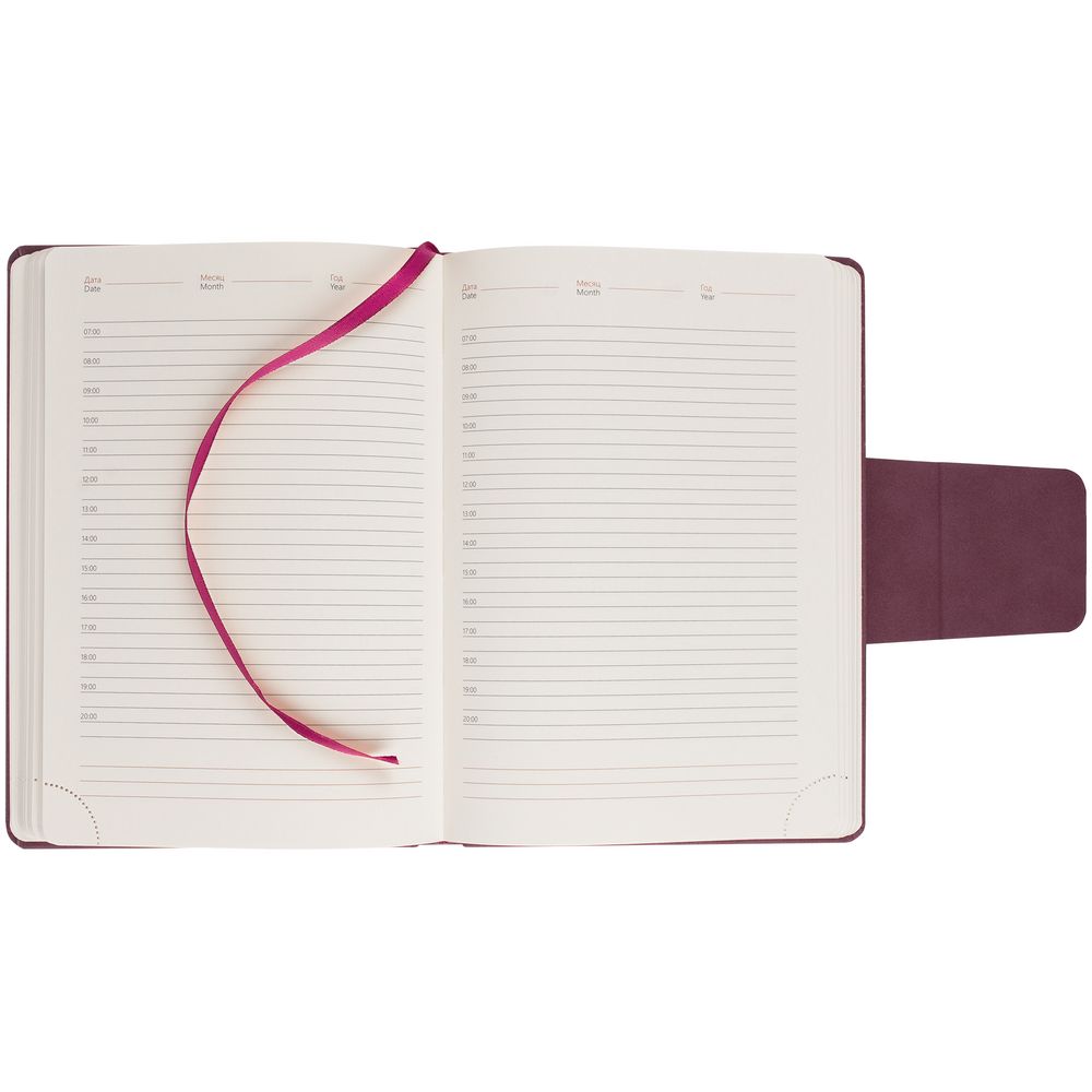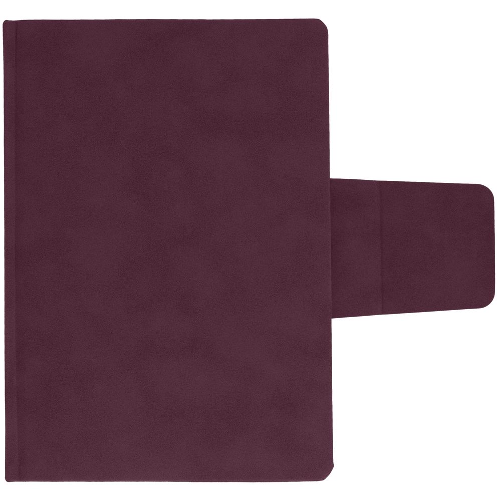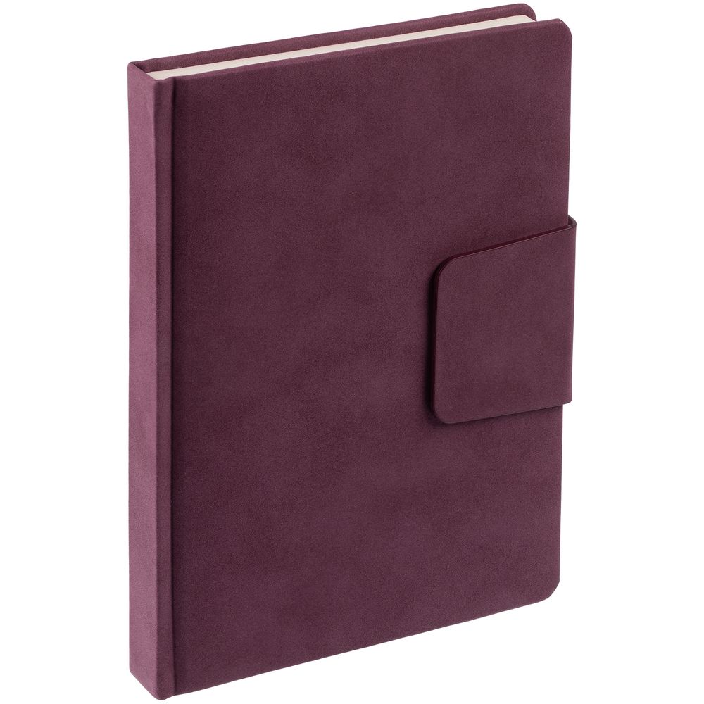 Ежедневник с твердой обложкой c поролоном, выполнен из материала Nubuck, винный SS, дополнен капталом и ляссе бордового цвета. Застежка — хлястик на магните.