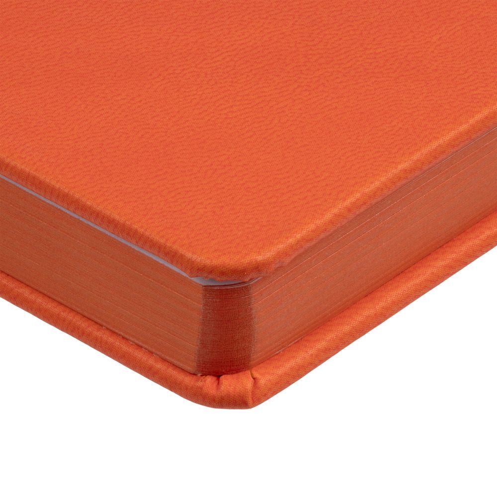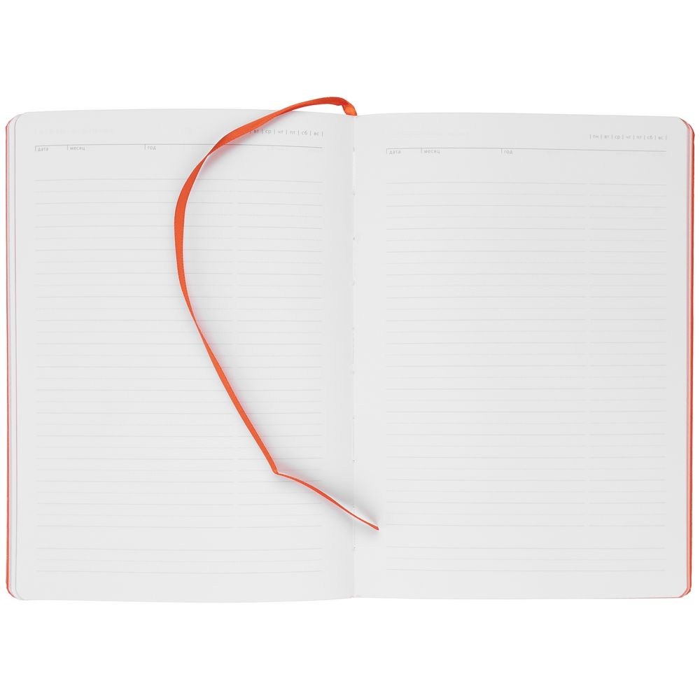 Ежедневник с твердой обложкой и тонированным обрезом. Выполнен из материала Latte, оранжевый, дополнен ляссе в цвет обложки.