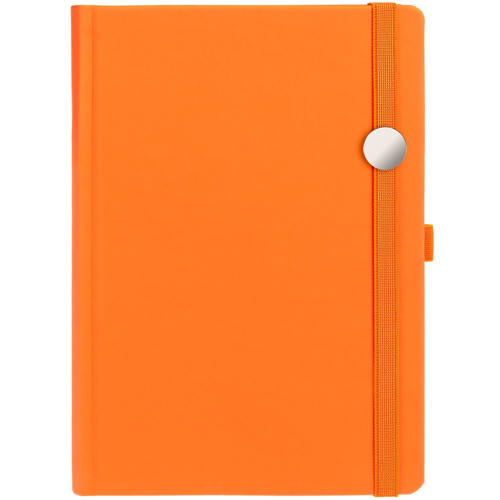 Ежедневник с твердой обложкой без поролона, выполнен из материала Soft Touch, оранжевый ОО, дополнен резинкой шириной 1 см, петлей-резинкой для ручки, капталом и ляссе оранжевого цвета.