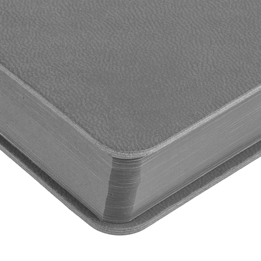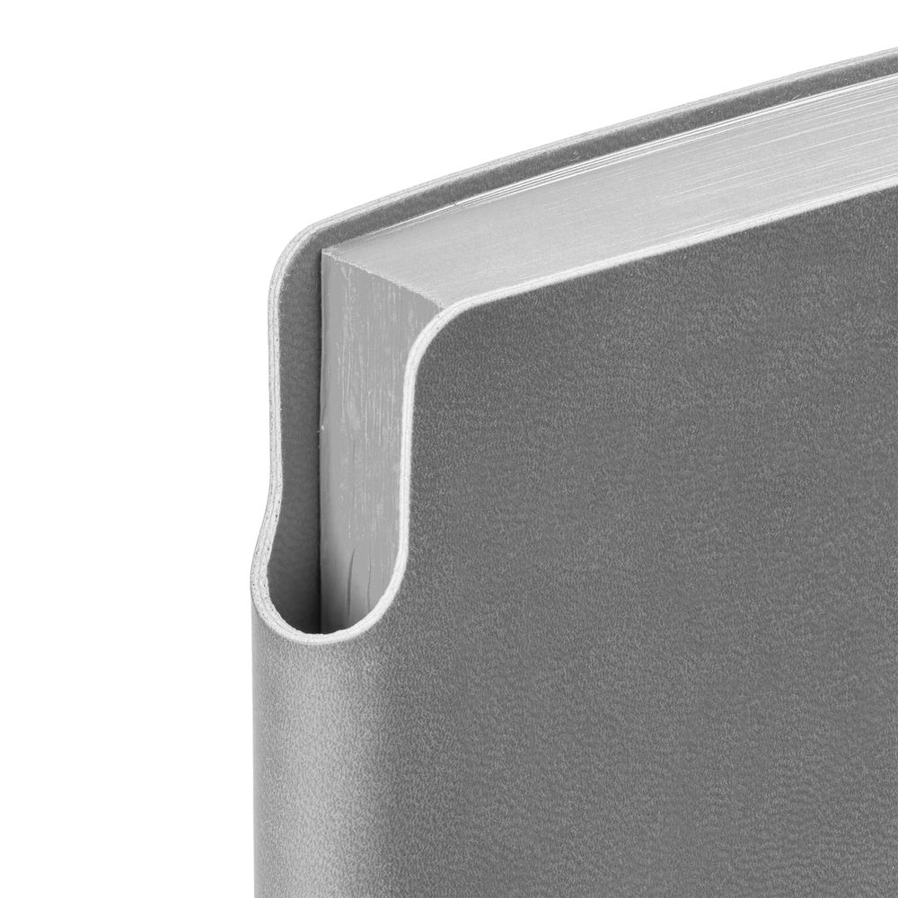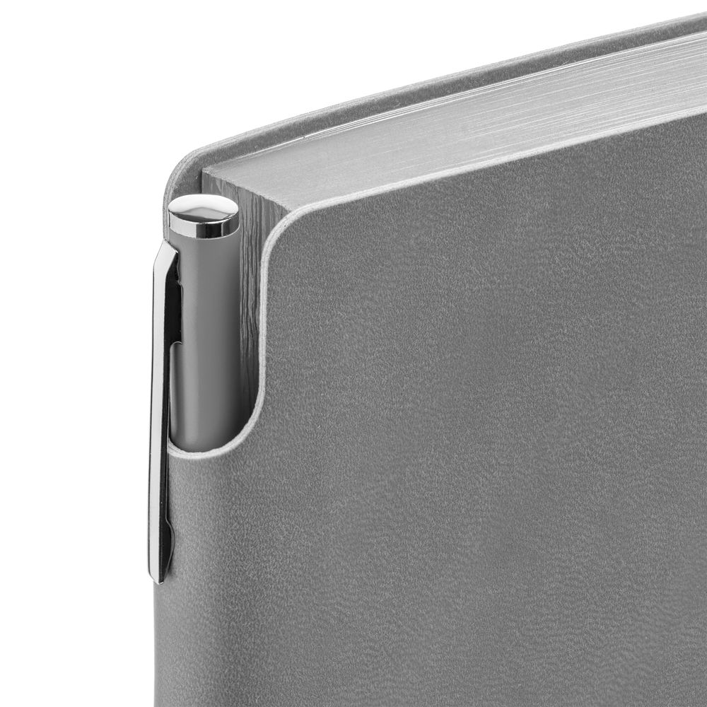 Гибкая обложка ежедневника выполнена из материала Latte, серый СС. Внутри корешка — специальное место для крепления ручки размером до 15х0,9 см.