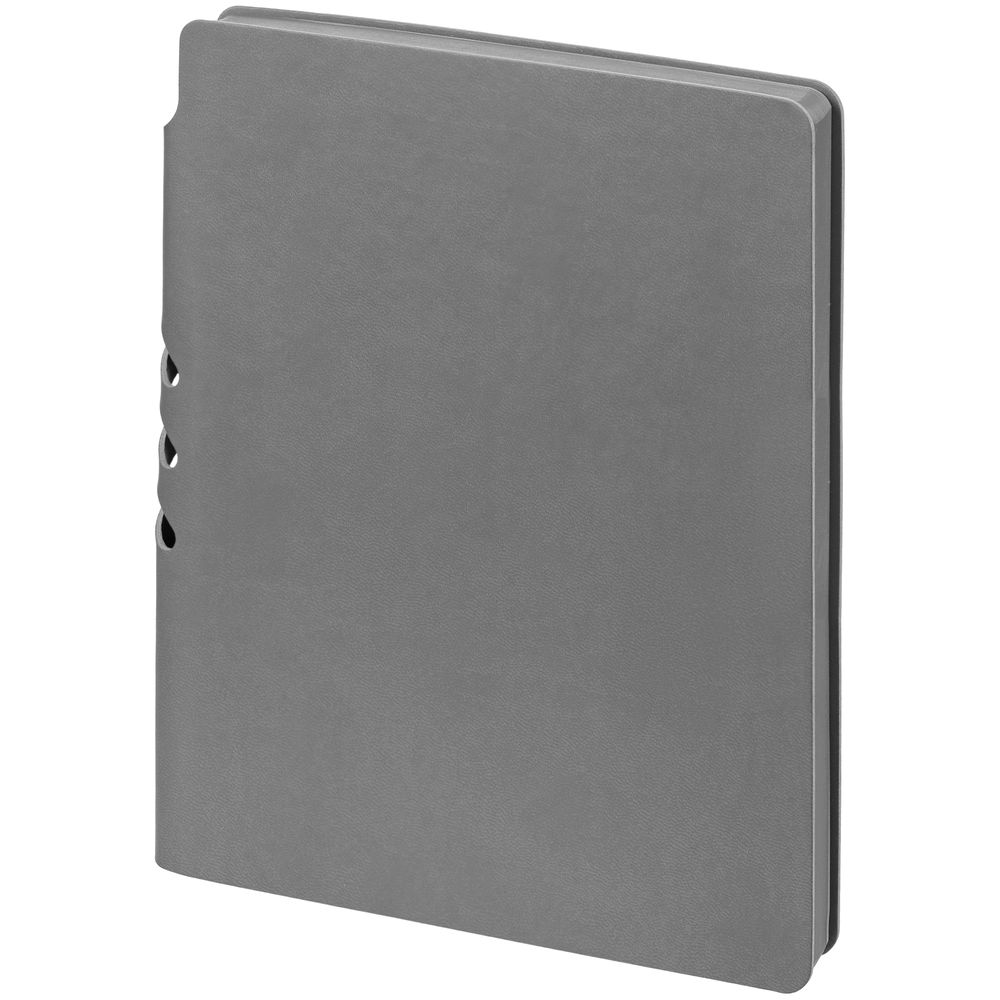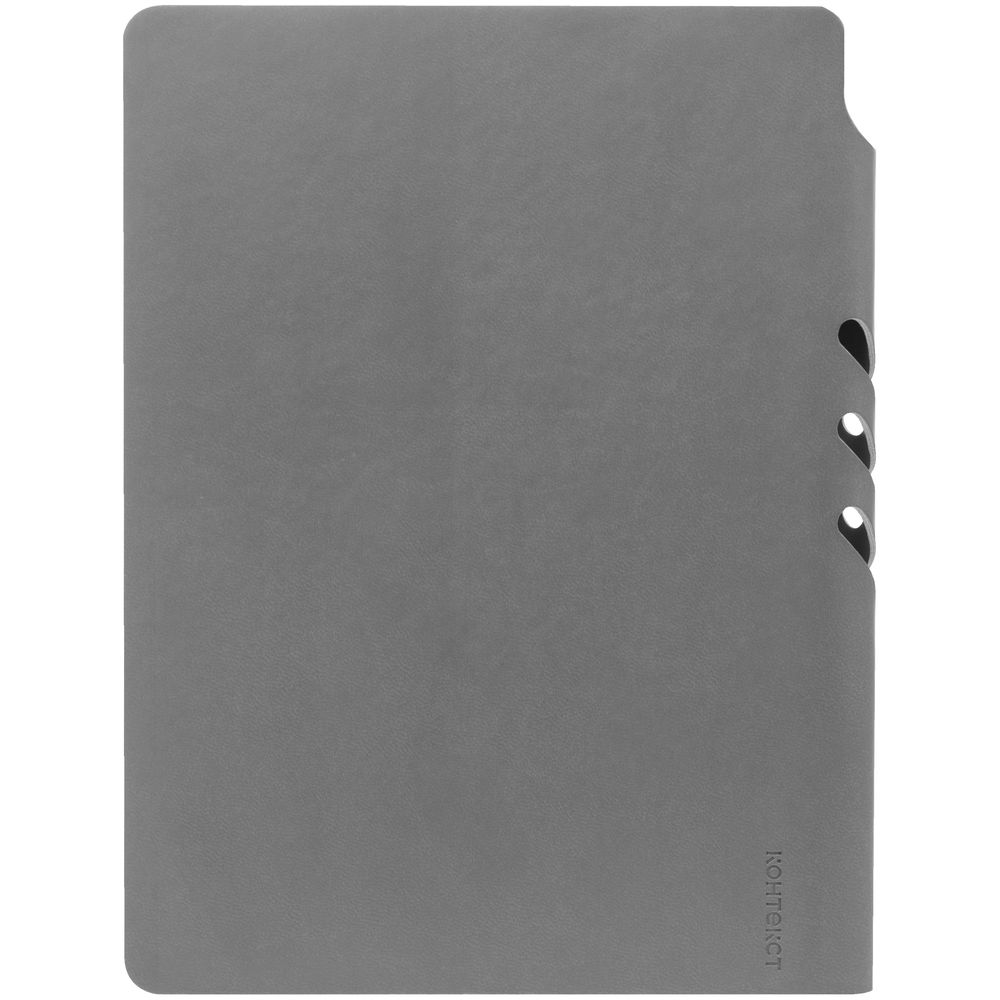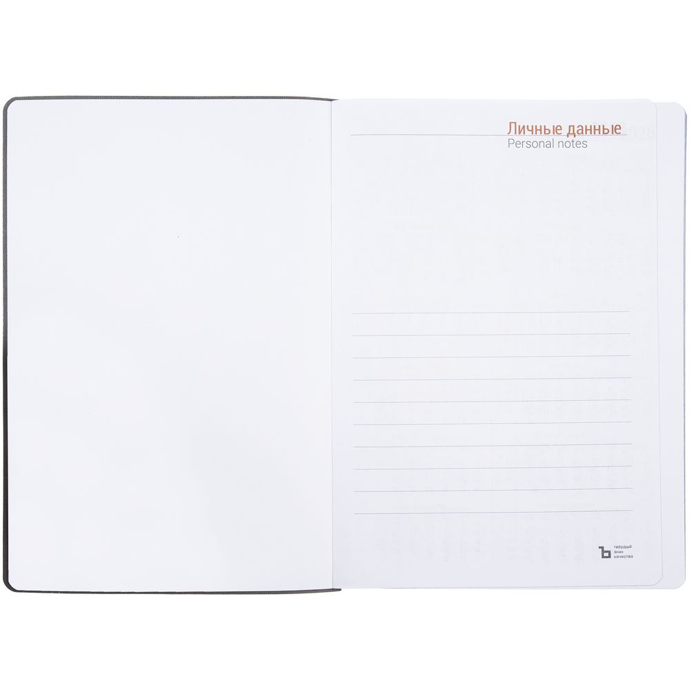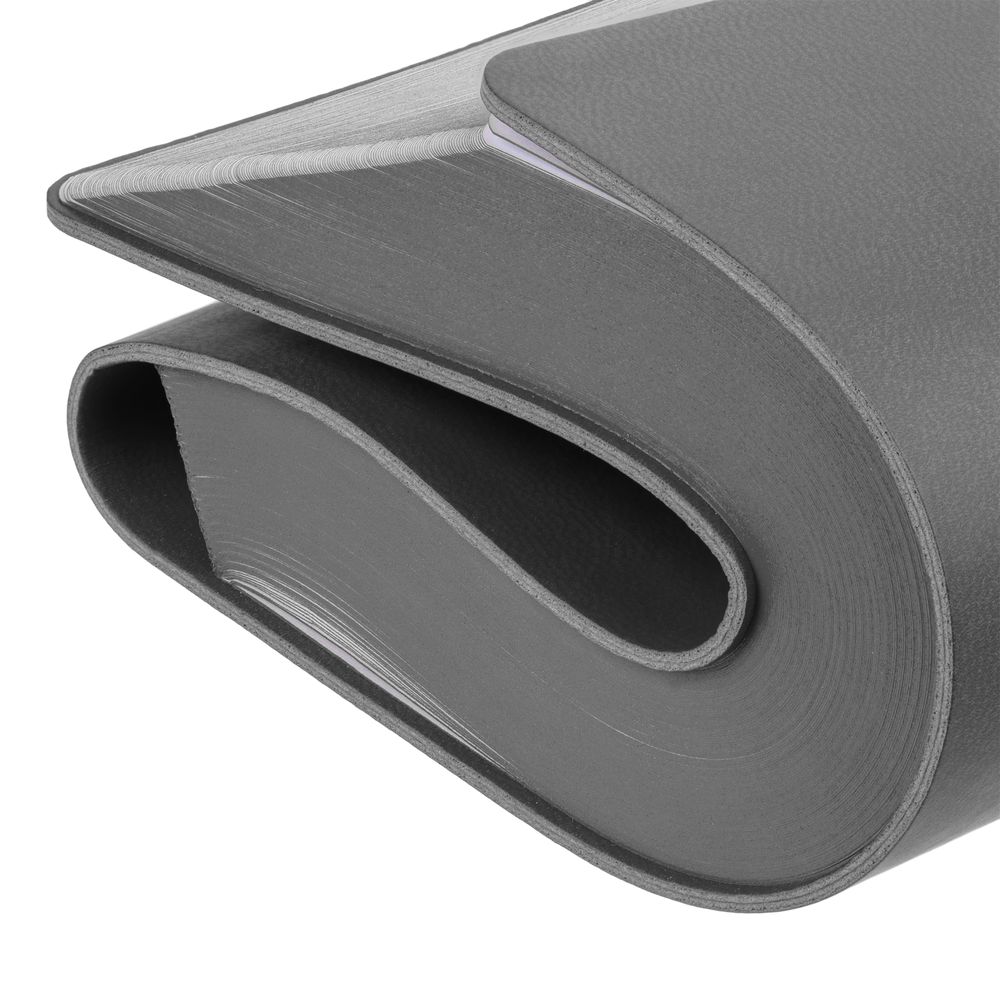 Гибкая обложка ежедневника выполнена из материала Latte, серый СС. Внутри корешка — специальное место для крепления ручки размером до 15х0,9 см.