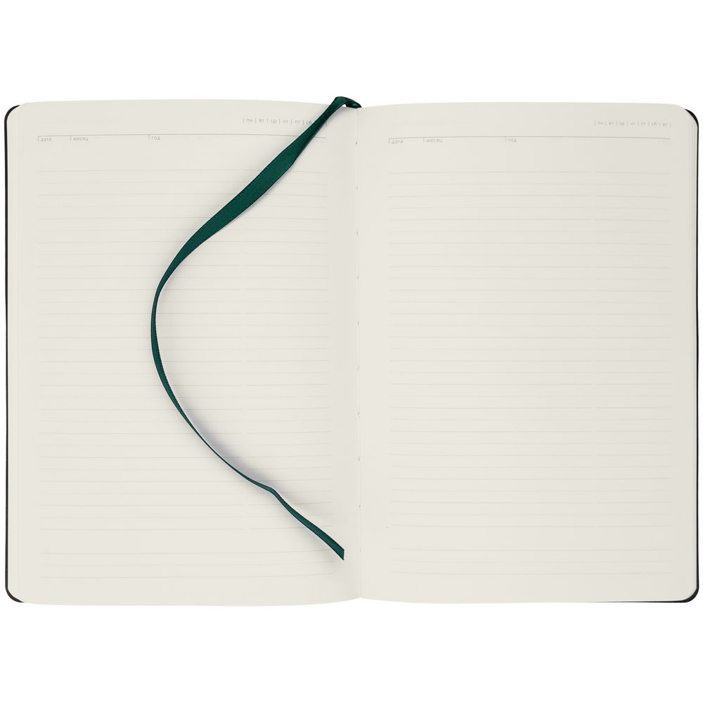 Ежедневник с гибкой обложкой, выполнен из материала Latte, зеленый, дополнен ляссе в цвет обложки.