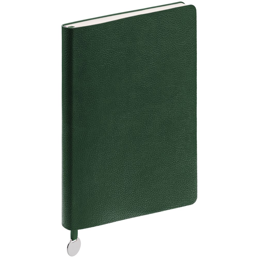 Ежедневник с гибкой обложкой, выполнен из материала La Fite, зеленый, дополнен ляссе в цвет обложки с металлическим шильдом.