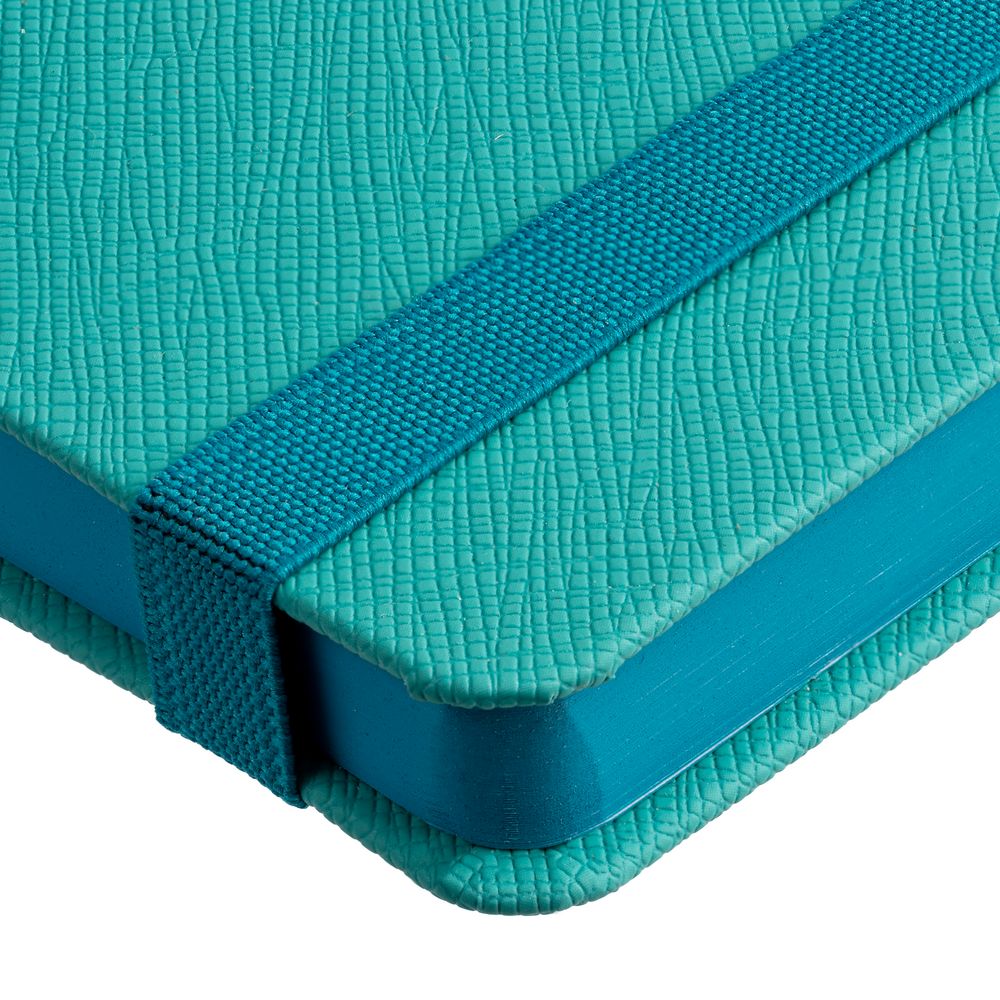 Ежедневник с твердой обложкой выполнен из материала Nice Touch,  морская волна II, и дополнен резинкой шириной 1 см и ляссе в цвет обложки.