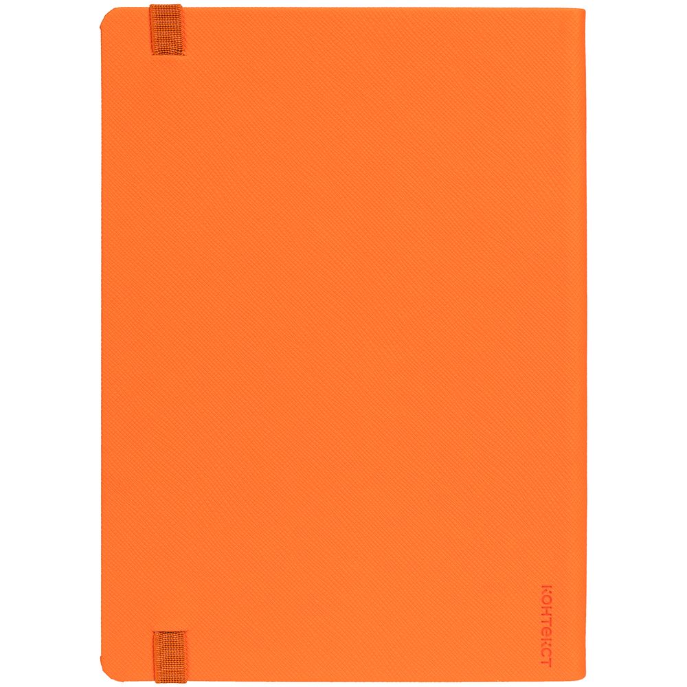 Ежедневник с твердой обложкой выполнен из материала Nice Touch, оранжевый ОО, и дополнен резинкой шириной 1 см и ляссе оранжевого цвета.