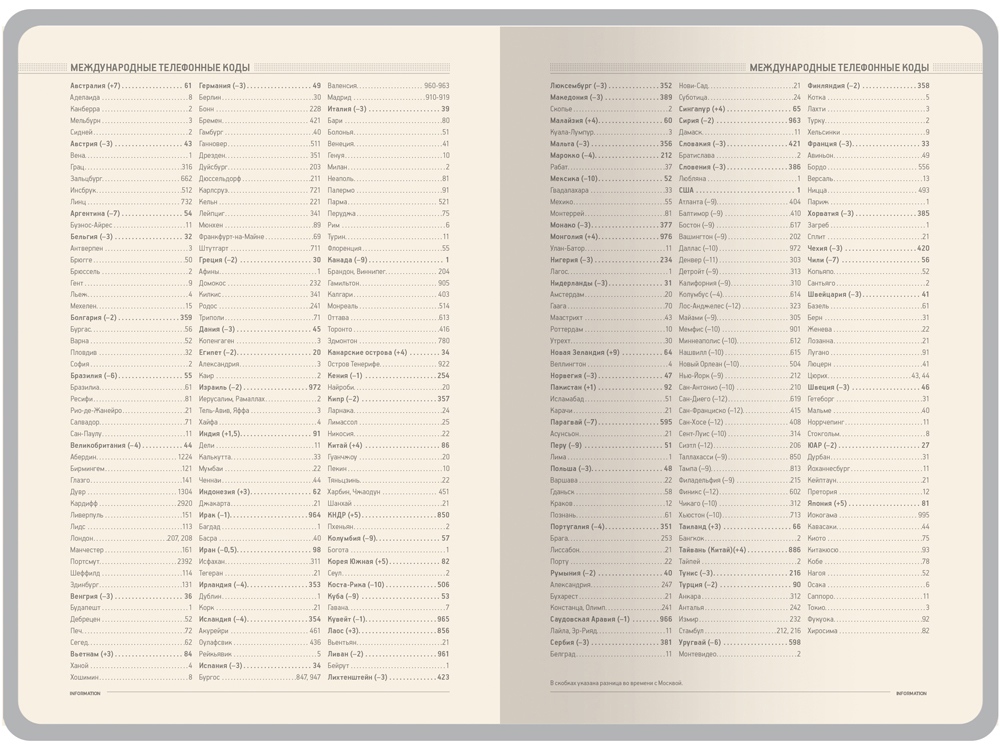• 19 страниц справочной информации (телефонные коды, буквенные коды, города-миллионники, автомобильные коды, энергетическая и питательная ценность продуктов, национальные праздники, скорость, давление, температура, страны мира, единицы измерения, штрихкоды, термины международной торговли, греческие буквы, размеры одежды, формат бумаги, религиозные праздники, аэропорты Европы, допустимое содержание алкоголя в крови, время распада алкоголя в крови);