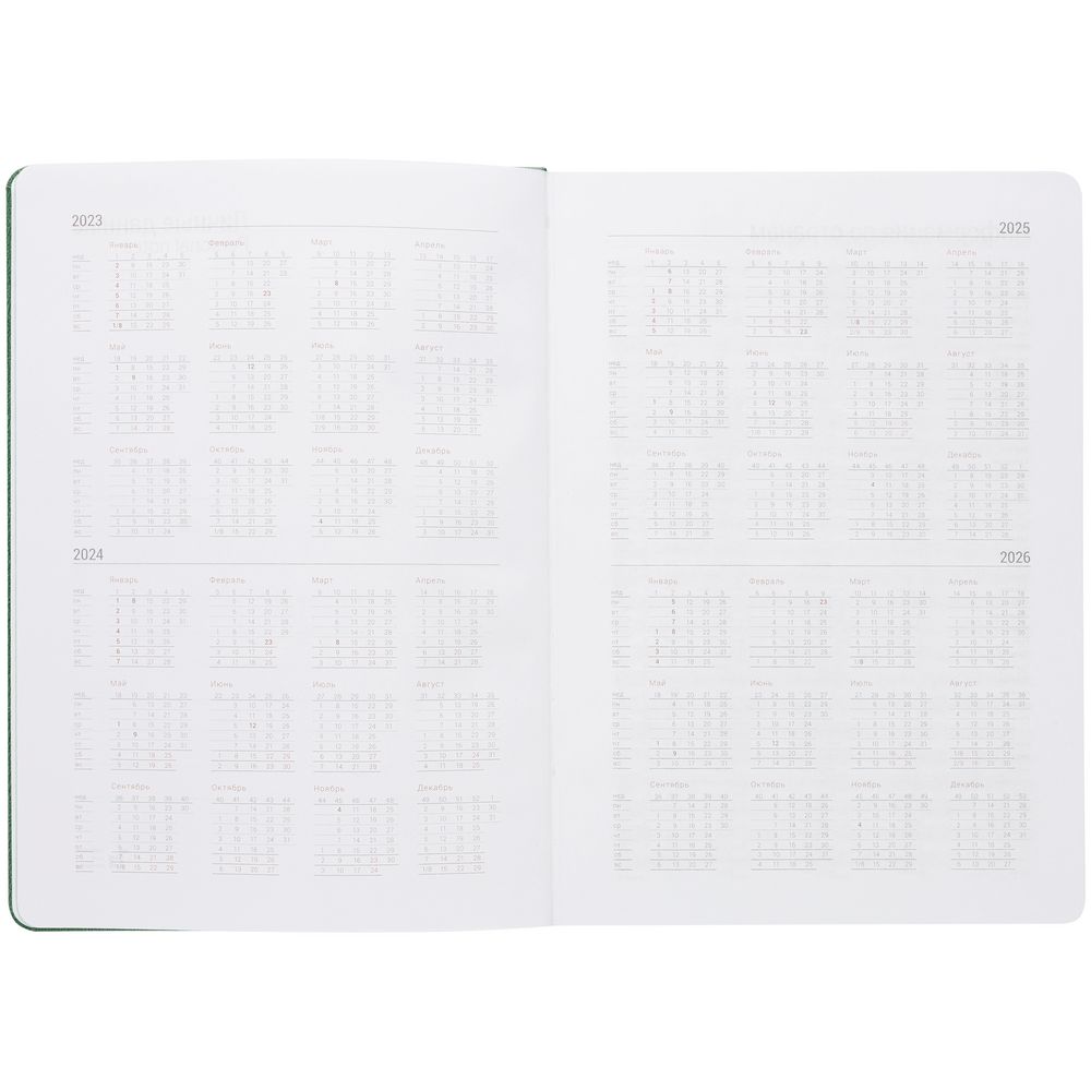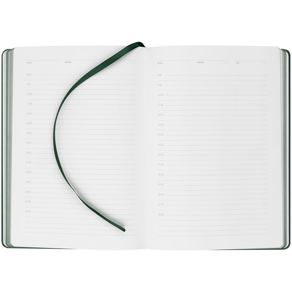 Ежедневник с твердой обложкой, выполнен из материала Latte, зеленый FF, обрез зеленого цвета, дополнен ляссе зеленого цвета и резинкой с металлическим шильдом.