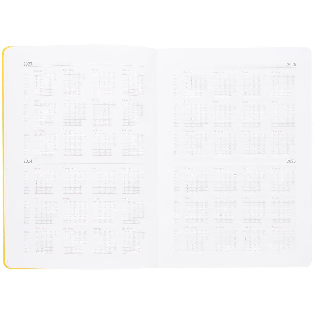 Ежедневник с твердой обложкой, выполнен из материала Latte, желтый КК, обрез зеленого цвета, дополнен ляссе желтого цвета и резинкой с металлическим шильдом.