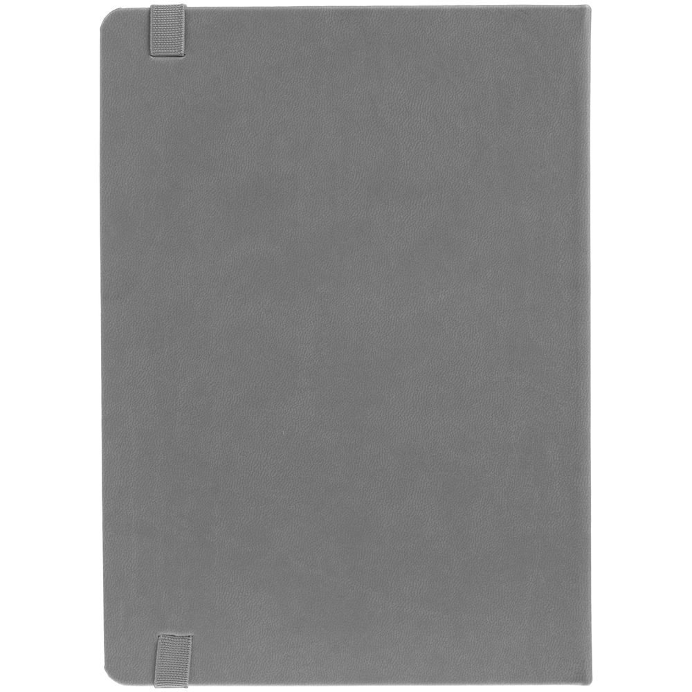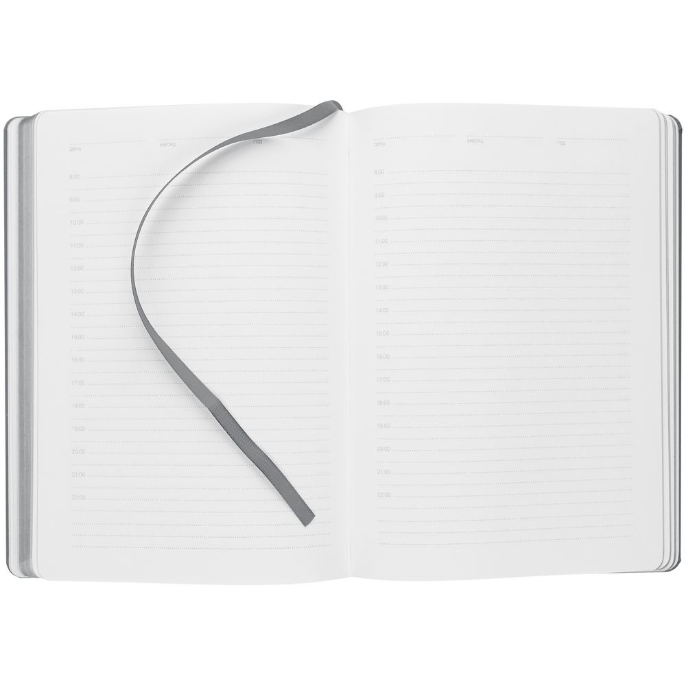 Ежедневник с твердой обложкой, выполнен из материала Latte, серый СС, обрез серого цвета, дополнен резинкой и ляссе серого цвета.
