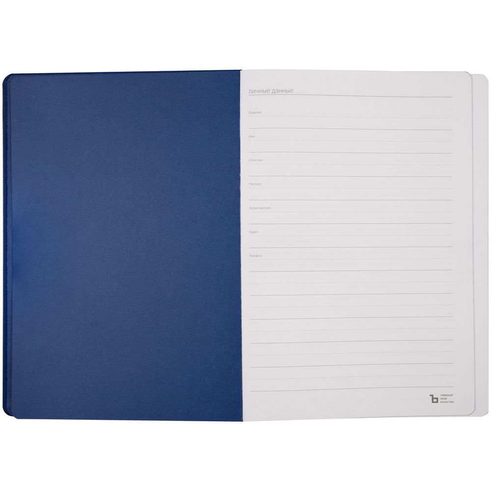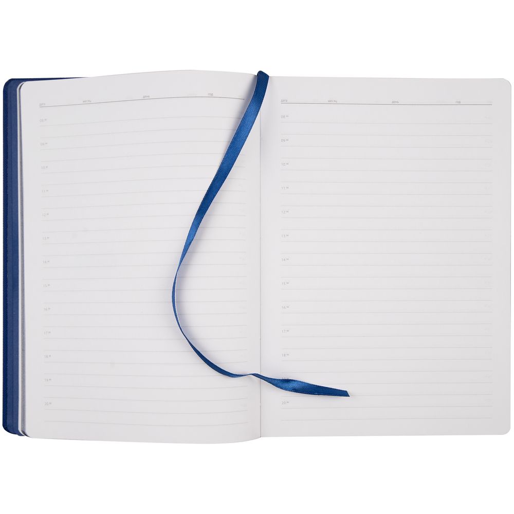Ежедневник с твердой обложкой, выполнен из материала Nice Touch, синий, дополнен резинкой с лейблом из материала Soft Touch Ultra и ляссе в цвет обложки.