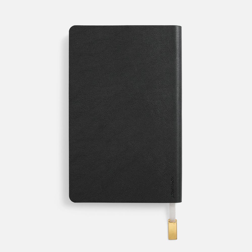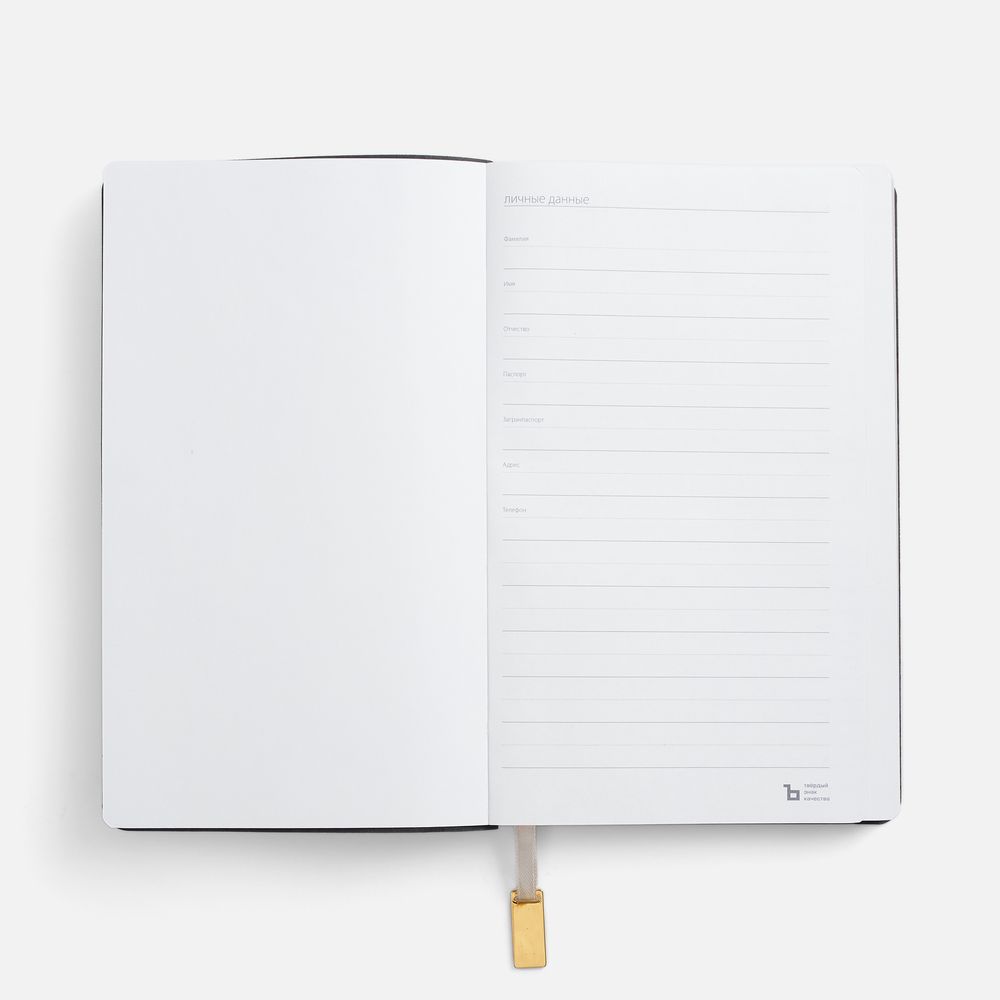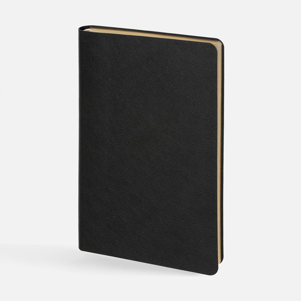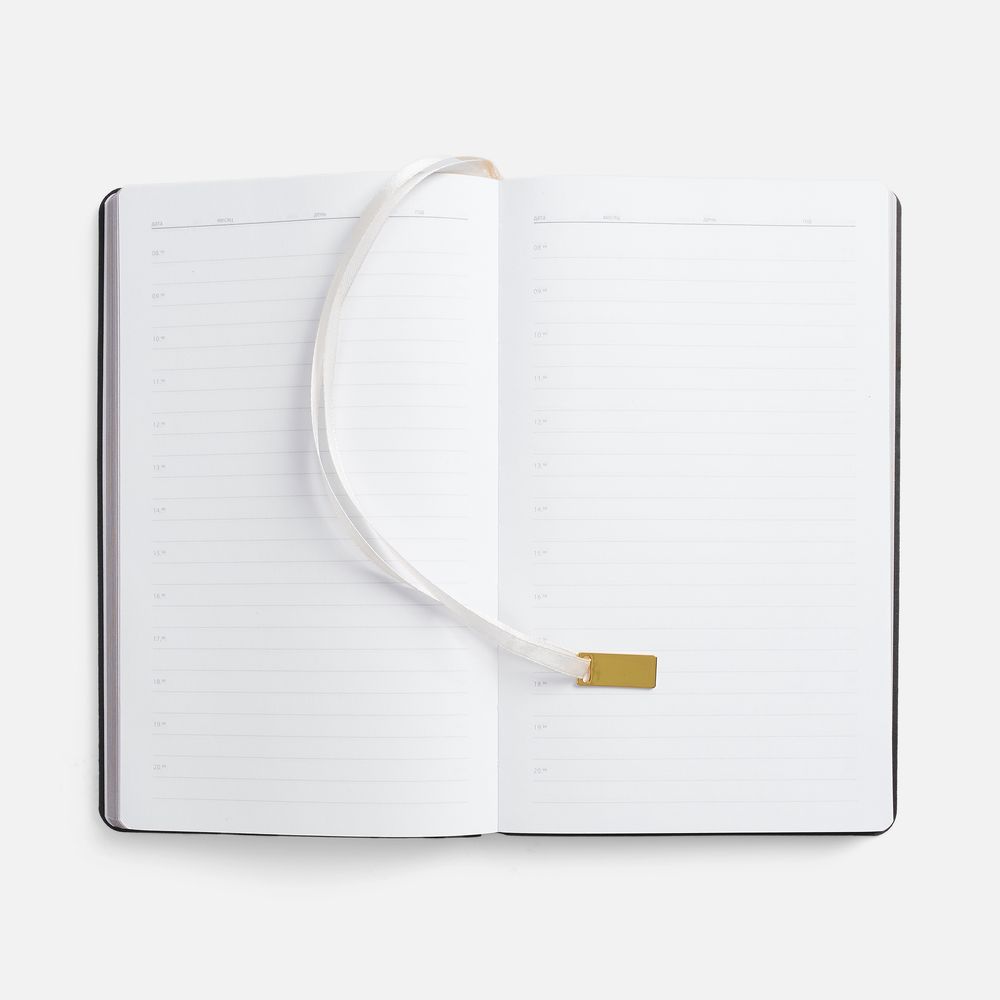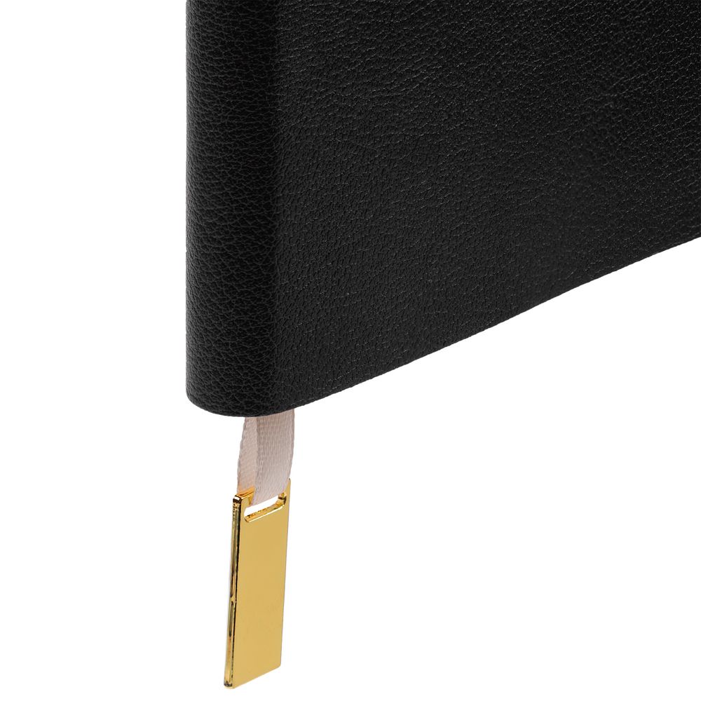 Ежедневник с гибкой обложкой, выполнен из материала Petrus, черный АА, дополнен серым ляссе с металлическим золотистым шильдиком.