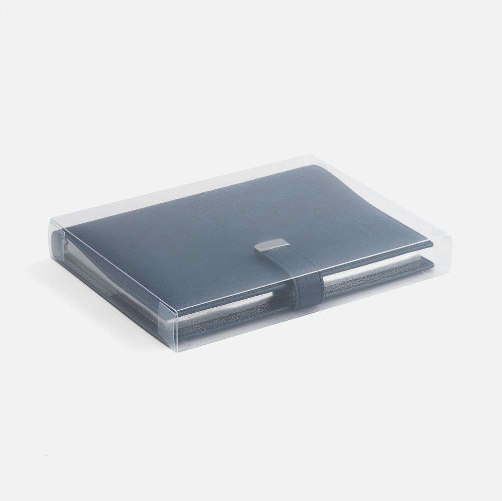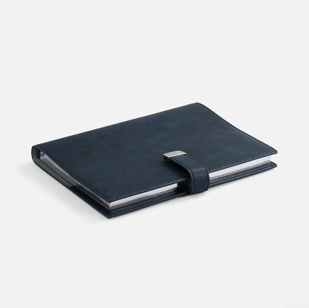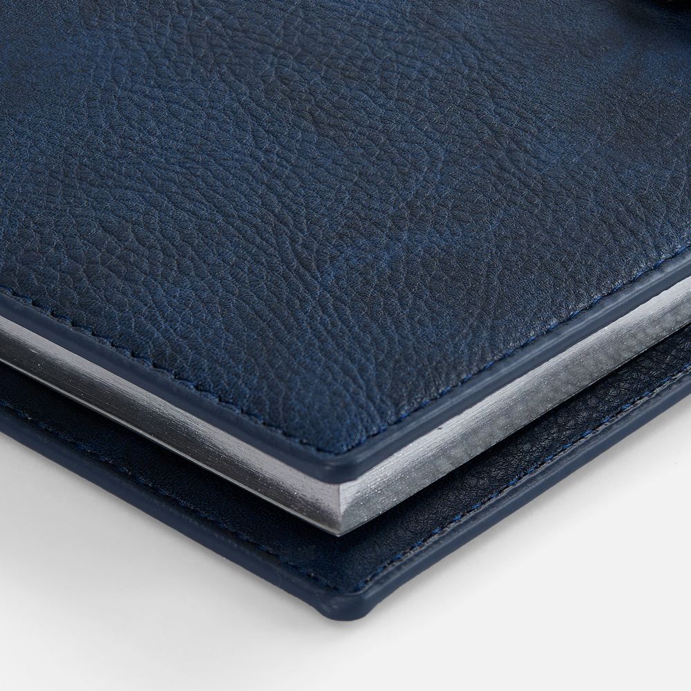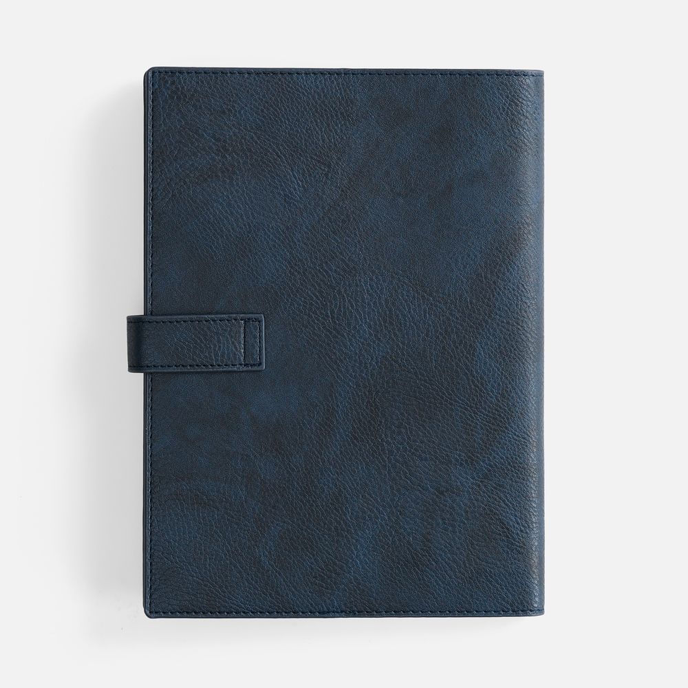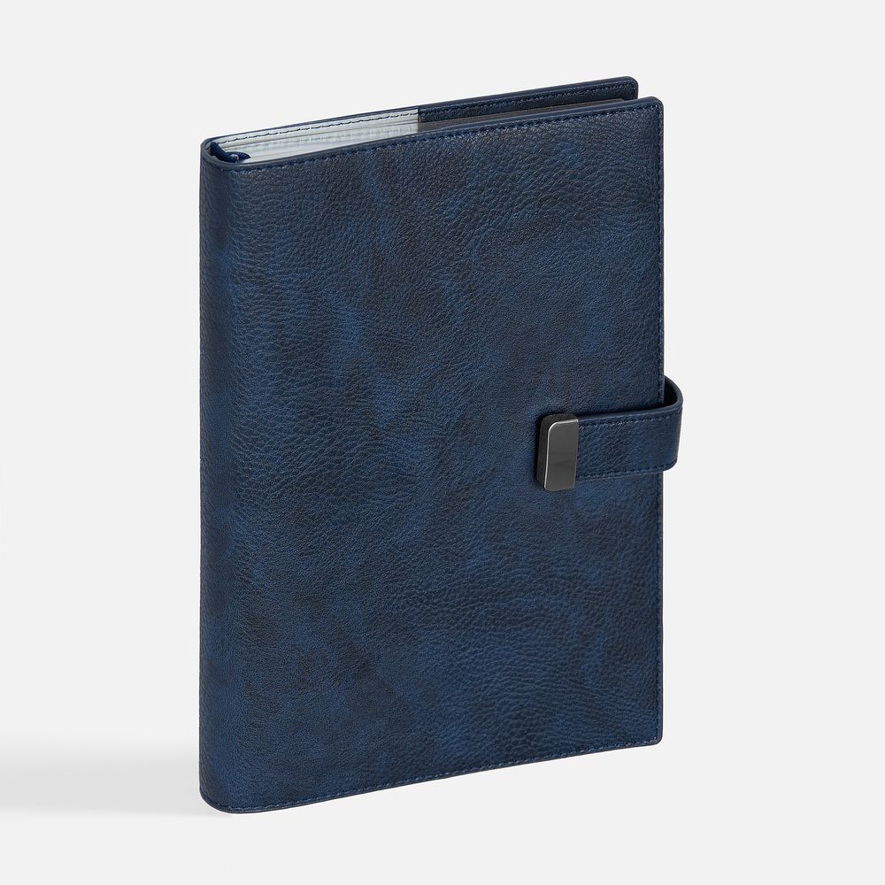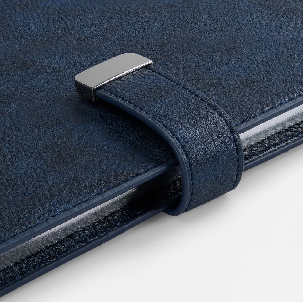 Ежедневник в мягком переплете со съемной обложкой, дополнен застежкой-хлястиком с металлическим шильдом на кнопке, двойным ляссе и капталом.