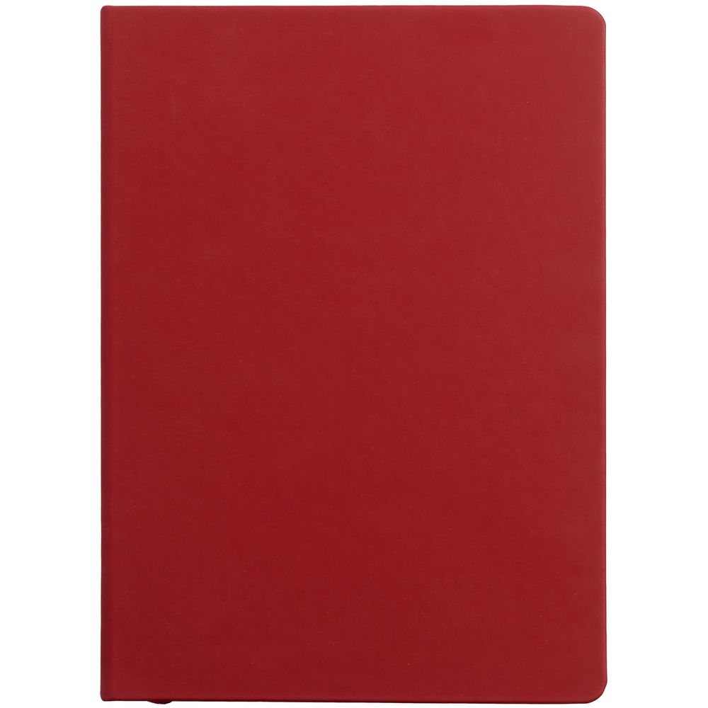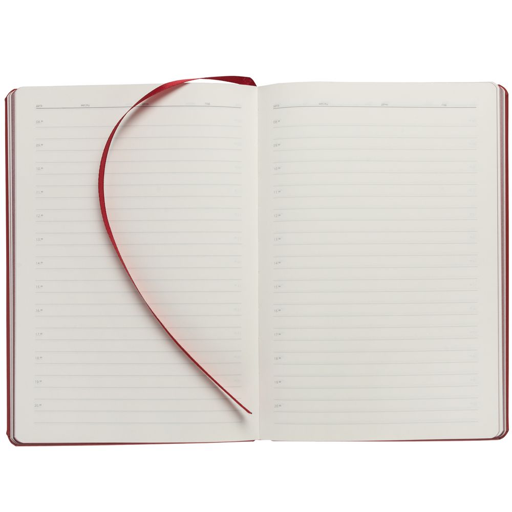Ежедневник с твердой обложкой и тонированным обрезом, выполнен из материала Soft Touch, красный РР, дополнен ляссе в цвет обложки.