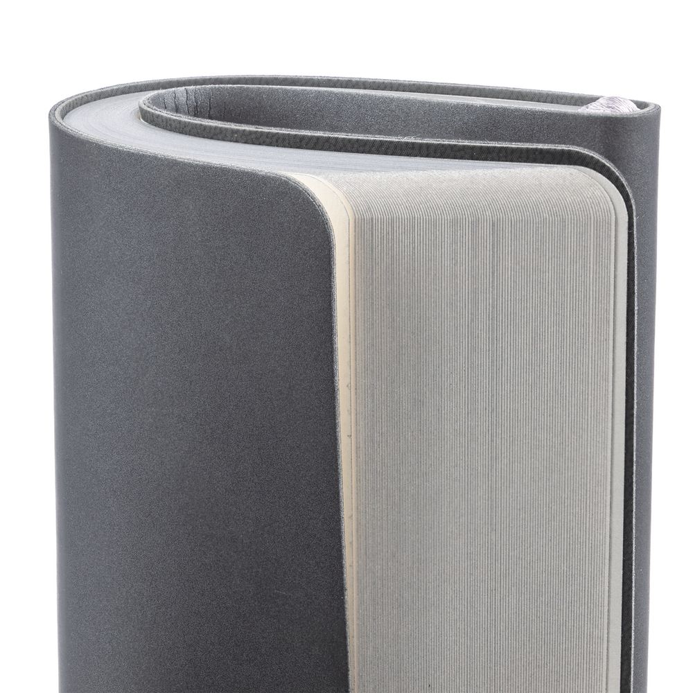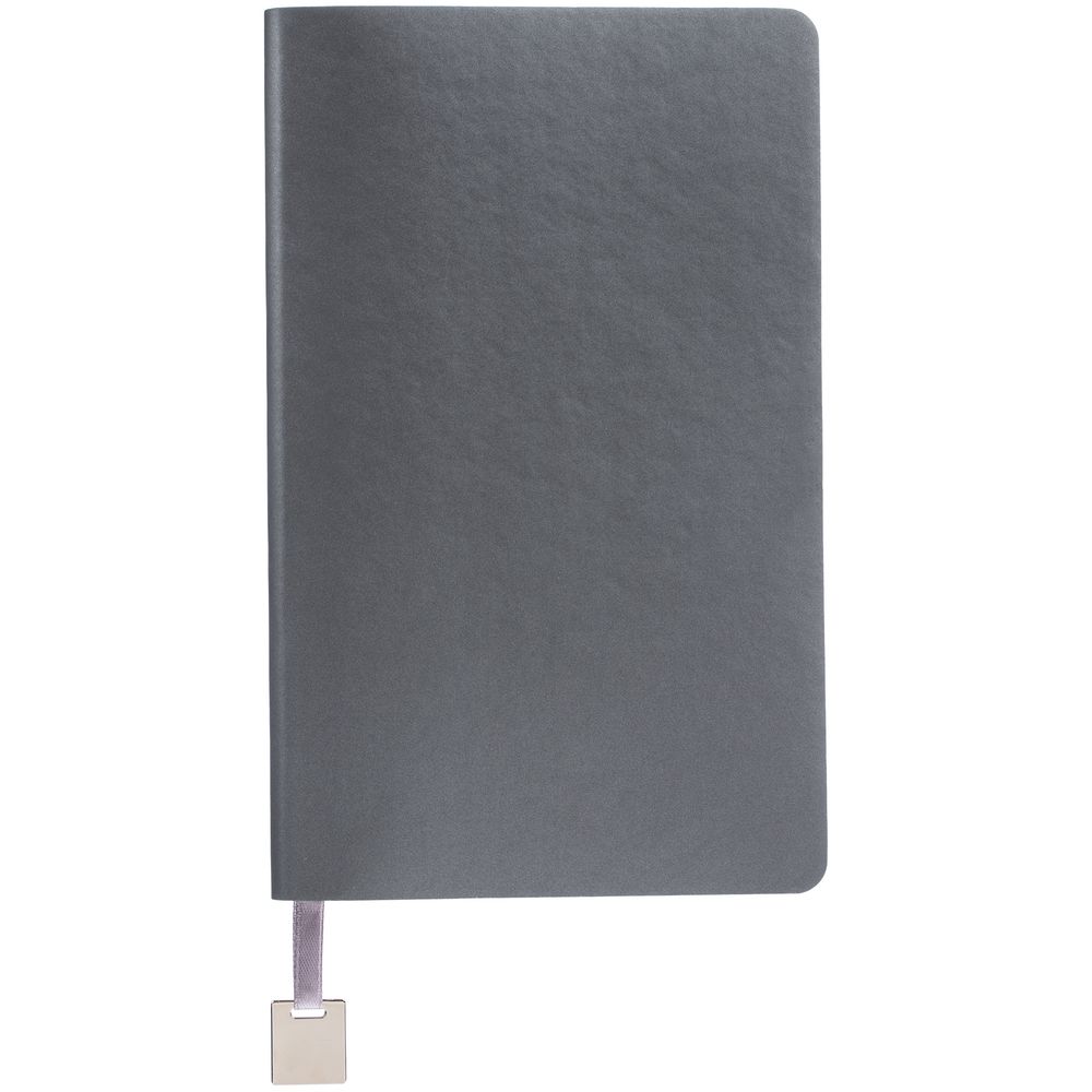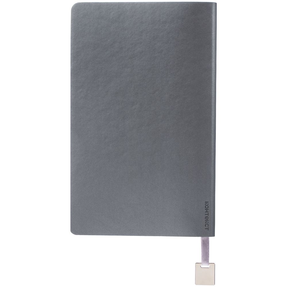 Ежедневник с гибкой обложкой, выполнен из материалов Soft Touch Pearl, серый СС, и Latte, серый (внутренняя часть обложки), дополнен ляссе в цвет обложки с металлическим шильдиком.