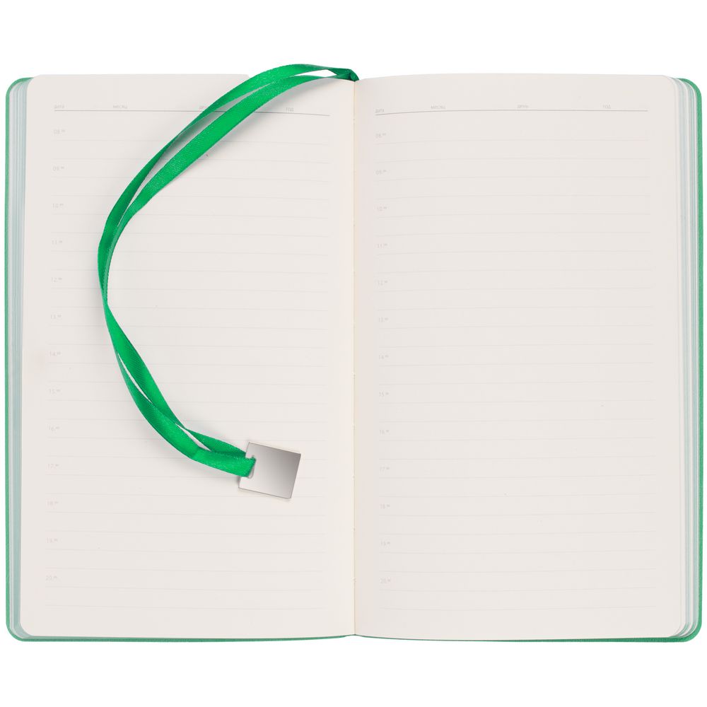 Ежедневник с гибкой обложкой, выполнен из материалов Soft Touch Ultra, зеленый FF, и Latte, зеленй (внутренняя часть обложки), дополнен ляссе в цвет обложки с металлическим шильдиком.