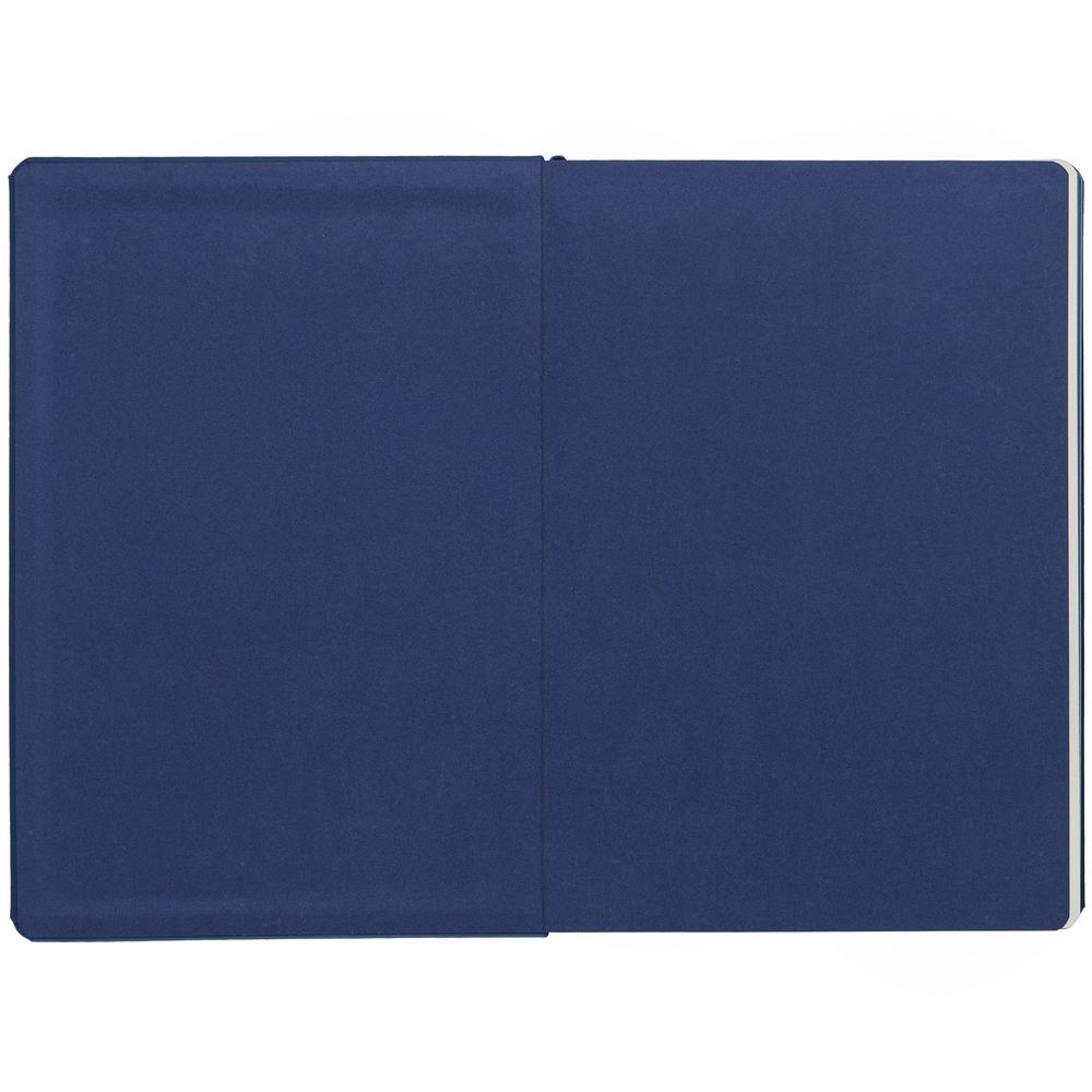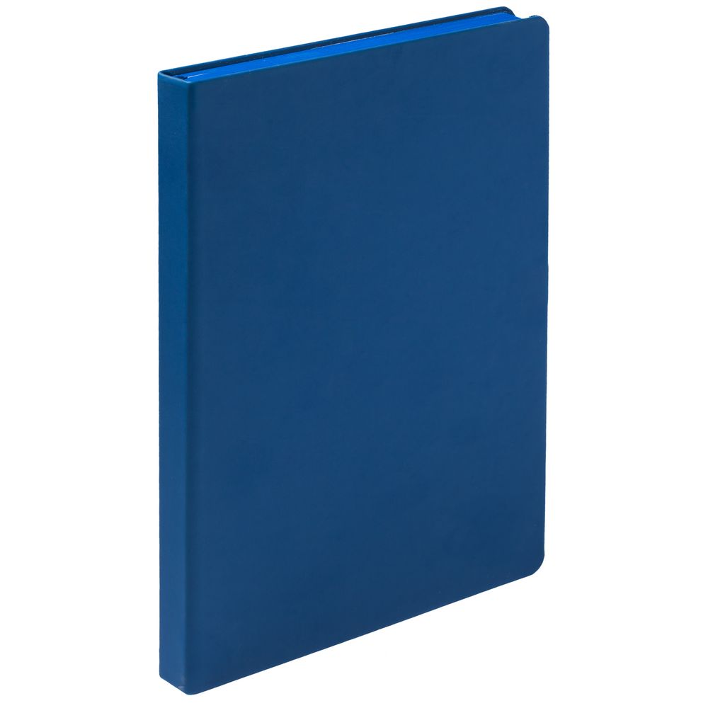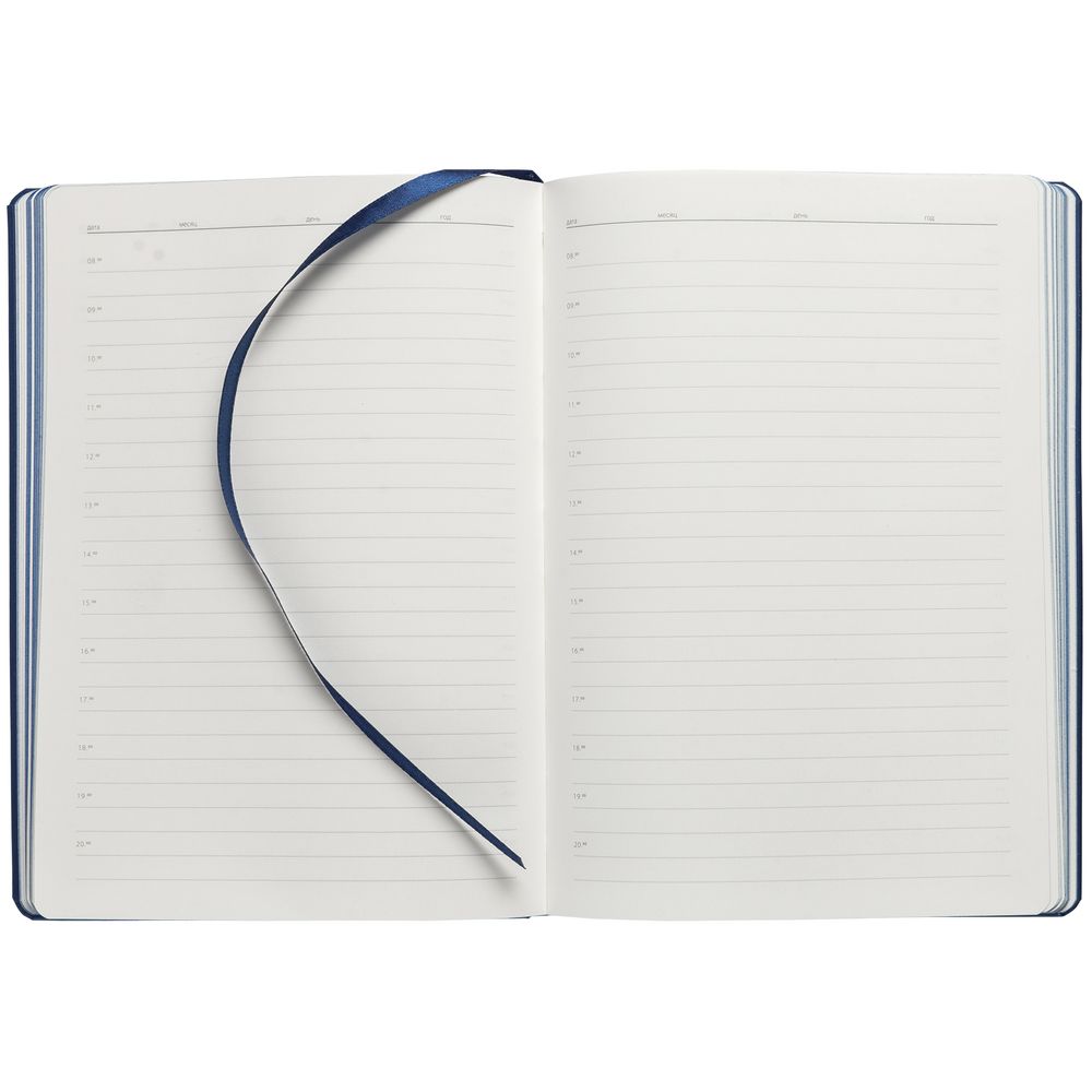 Ежедневник с твердой обложкой и тонированным обрезом, выполнен из материала Soft Touch, синий НН, дополнен ляссе в цвет обложки.