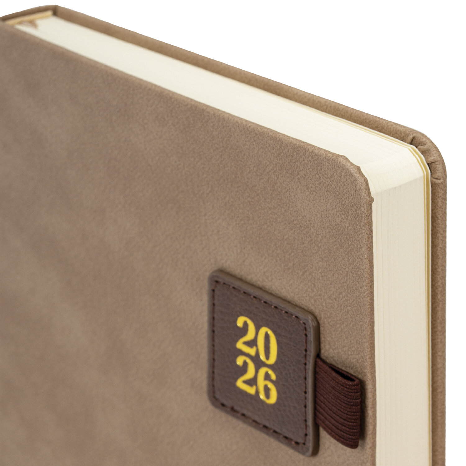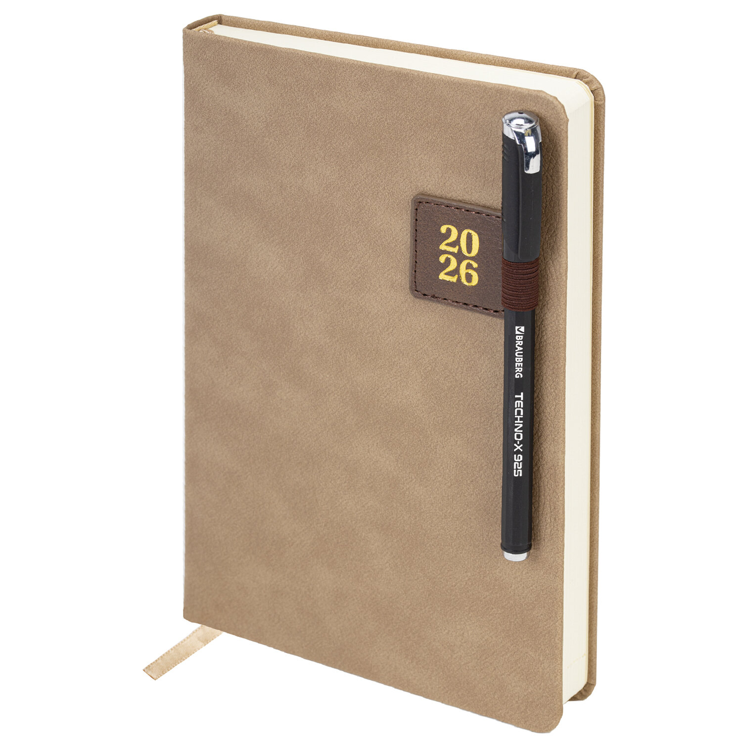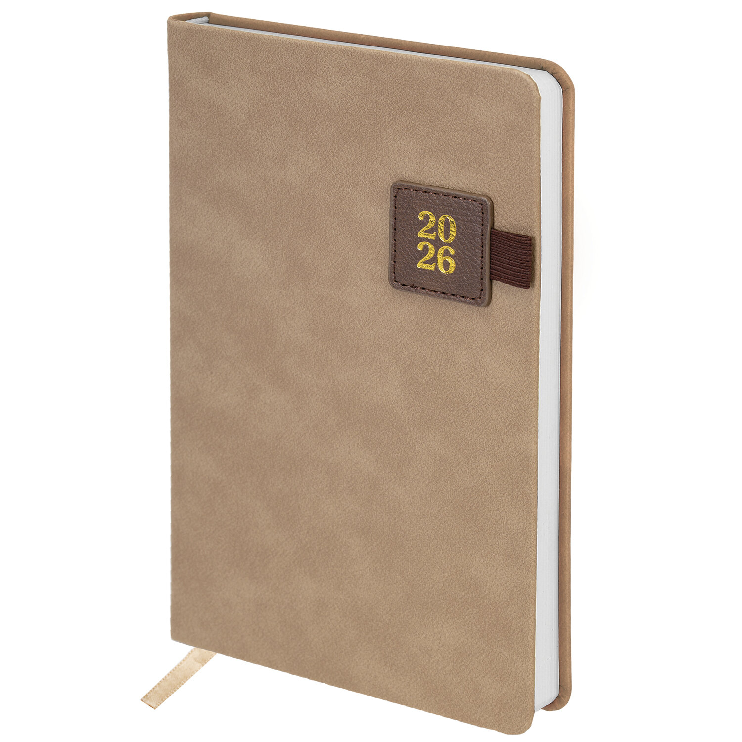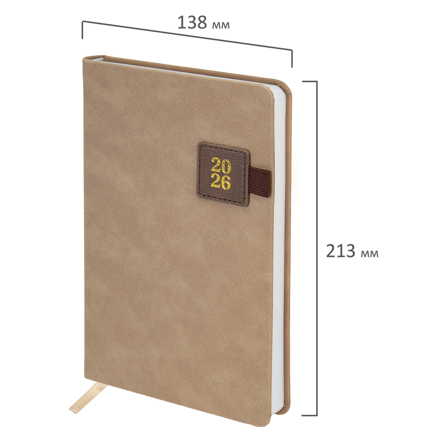 Ежедневник датированный 2026 А5 138х213 мм, BRAUBERG «Accent», под кожу, держатель, бежевый/коричневый, 117388