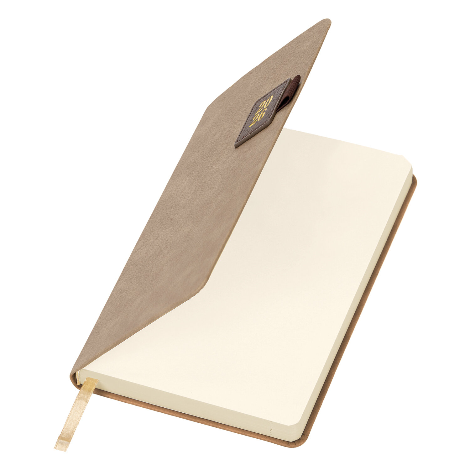 Внутренний блок включает 168 листов кремовой бумаги плотностью 70 г/м2. Каждая страничка имеет перфорированный угол. Благодаря стандартному формату А5 (138х213 мм) датированный ежедневник удобно использовать как в офисе, так и на выездных деловых встречах. Твердая обложка стилизована под текстурную кожу и имеет интересную деталь в виде нашивки контрастного цвета. Подходит для горячего тиснения. Дополнением является закладка-ляссе, с помощью которой при необходимости можно быстро открыть ежедневник на нужной странице, и держатель для ручки. Ежедневник снабжен справочным материалом. В конце имеются 4 страницы для записей и заметок.