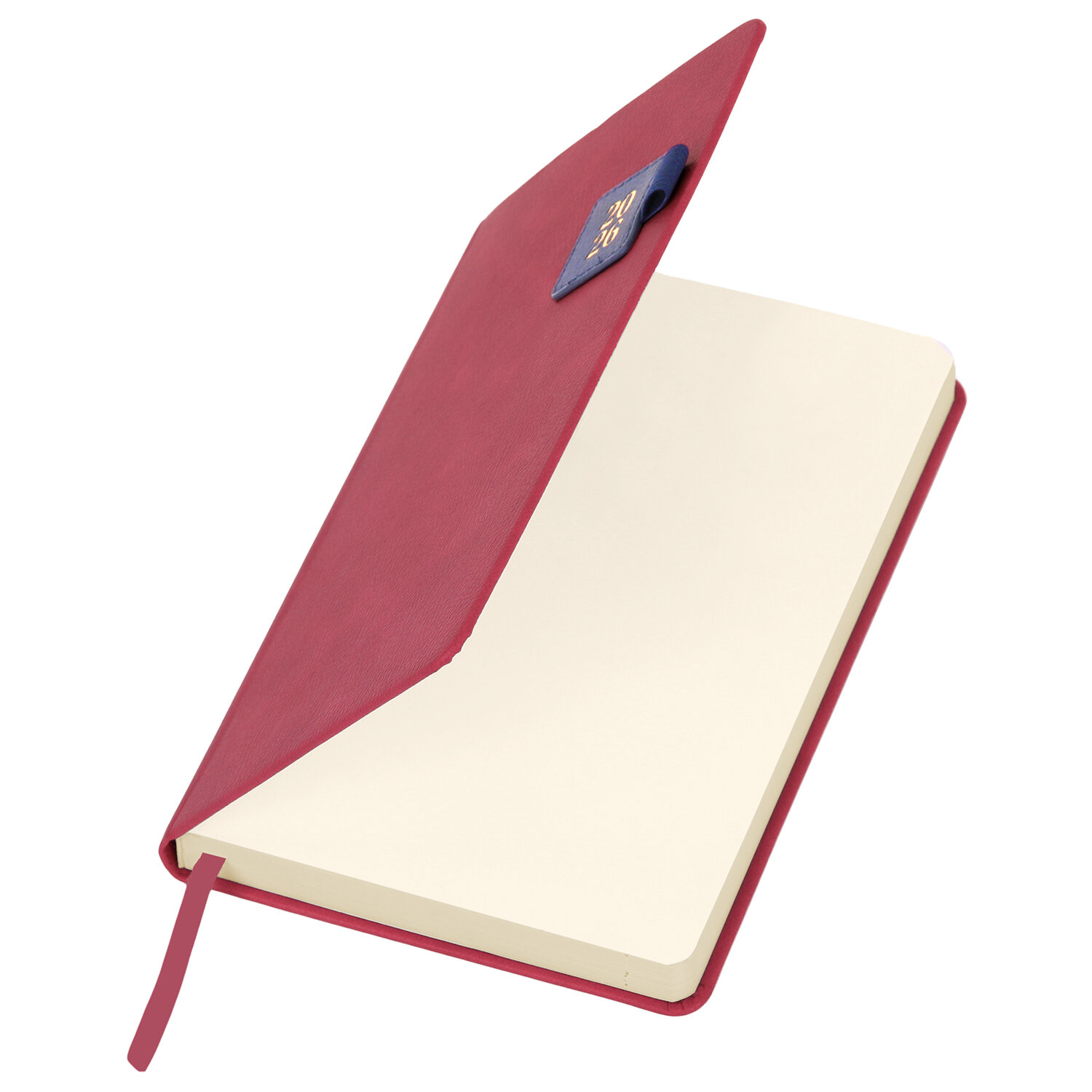Внутренний блок включает 168 листов кремовой бумаги плотностью 70 г/м2. Каждая страничка имеет перфорированный угол. Благодаря стандартному формату А5 (138х213 мм) датированный ежедневник удобно использовать как в офисе, так и на выездных деловых встречах. Твердая обложка стилизована под текстурную кожу и имеет интересную деталь в виде нашивки контрастного цвета. Подходит для горячего тиснения. Дополнением является закладка-ляссе, с помощью которой при необходимости можно быстро открыть ежедневник на нужной странице, и держатель для ручки. Ежедневник снабжен справочным материалом. В конце есть 4 страницы для записей и заметок.
