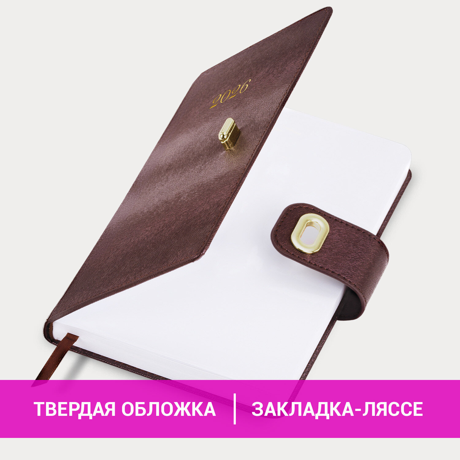 Внутренний блок включает 168 листов белой бумаги плотностью 70 г/м2. Каждая страничка имеет перфорированный угол. Благодаря стандартному формату А5 (138×213 мм) ежедневник удобно использовать как в офисе, так и на выездных деловых встречах. Твердая обложка стилизована под текстурную кожу. Материал обложки подходит для горячего тиснения. Ежедневник фиксируется стильной металлической застежкой, поэтому он не откроется в сумке или портфеле и страницы не помнутся. Дополнением является закладка-ляссе, с помощью которой при необходимости можно быстро открыть ежедневник на нужной странице. Ежедневник снабжен обширным справочным материалом. В конце есть 4 страницы для записей и заметок.Датированный ежедневник BRAUBERG «Elegant» идеально подойдет для офисных работников и людей, занимающихся бизнесом.
