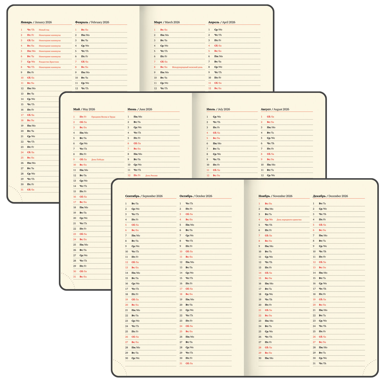 Внутренний блок включает 168 листов кремовой бумаги плотностью 70 г/м2. Каждая страничка имеет перфорированный угол. Благодаря стандартному формату А5 (138х213 мм) датированный ежедневник удобно использовать как в офисе, так и на выездных деловых встречах. Твердая обложка стилизована под текстурную кожу и имеет интересную деталь в виде корешка контрастного цвета. Поверхность подходит для горячего тиснения. Ежедневник снабжён двумя закладками-ляссе и держателем для ручки. Справочный материал дополнительно расширяет функциональность ежедневника. В конце внутреннего блока есть 4 страницы для записей и заметок.