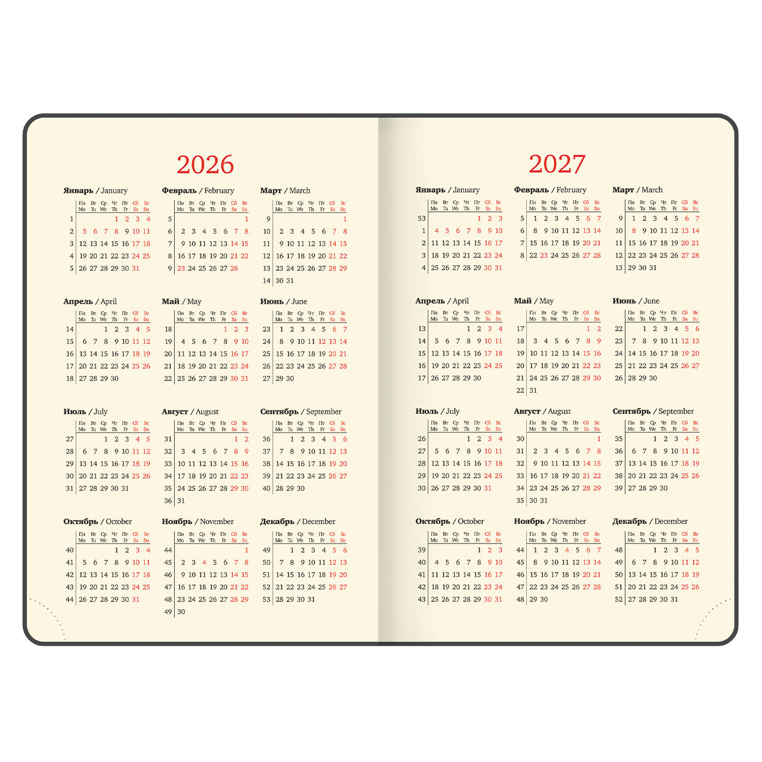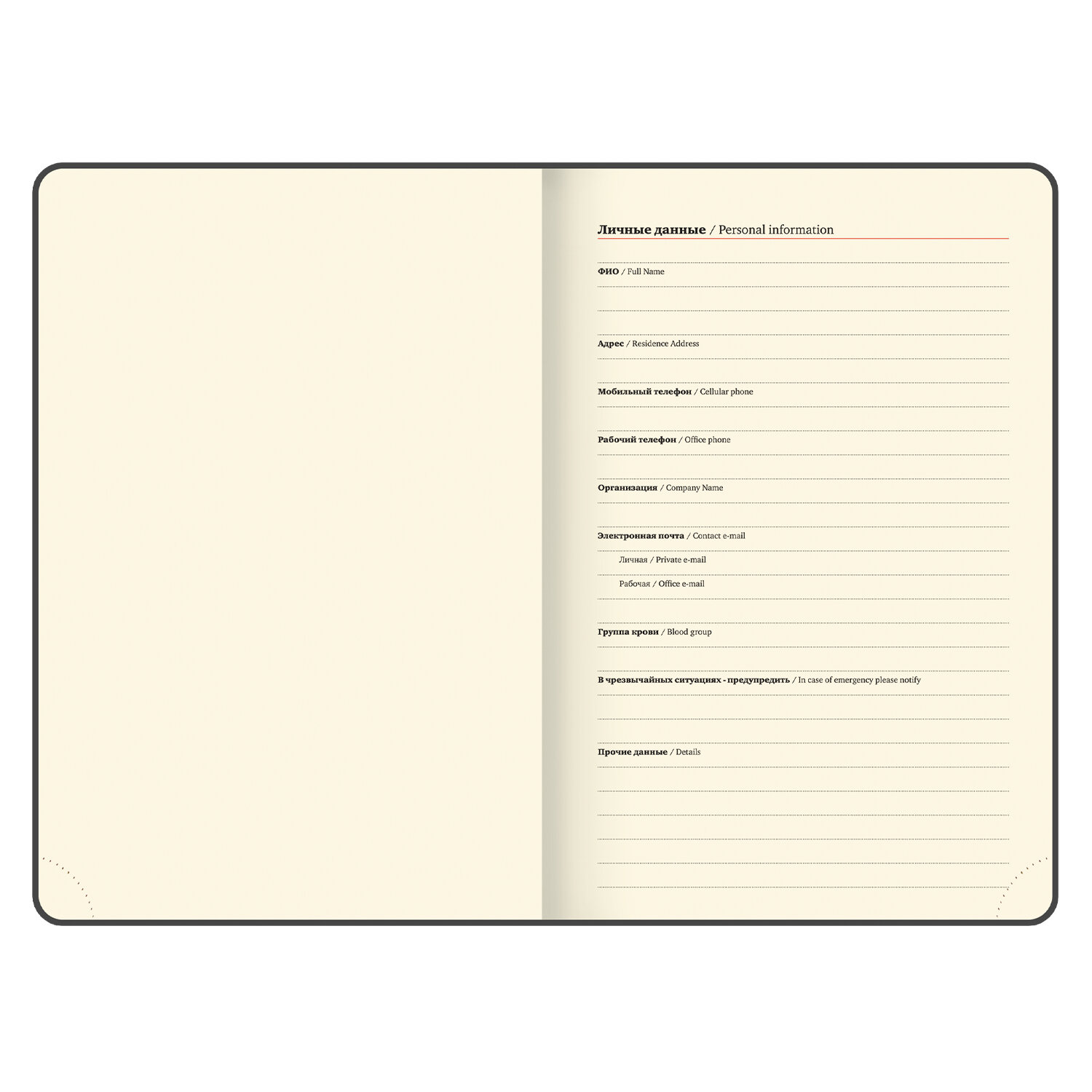 Внутренний блок включает 168 листов кремовой бумаги плотностью 70 г/м2. Каждая страничка имеет перфорированный угол. Благодаря стандартному формату А5 (138х213 мм) датированный ежедневник удобно использовать как в офисе, так и на выездных деловых встречах. Твердая обложка стилизована под текстурную кожу и имеет интересную деталь в виде корешка контрастного цвета. Поверхность подходит для горячего тиснения. Ежедневник снабжён двумя закладками-ляссе и держателем для ручки. Справочный материал дополнительно расширяет функциональность ежедневника. В конце внутреннего блока есть 4 страницы для записей и заметок.