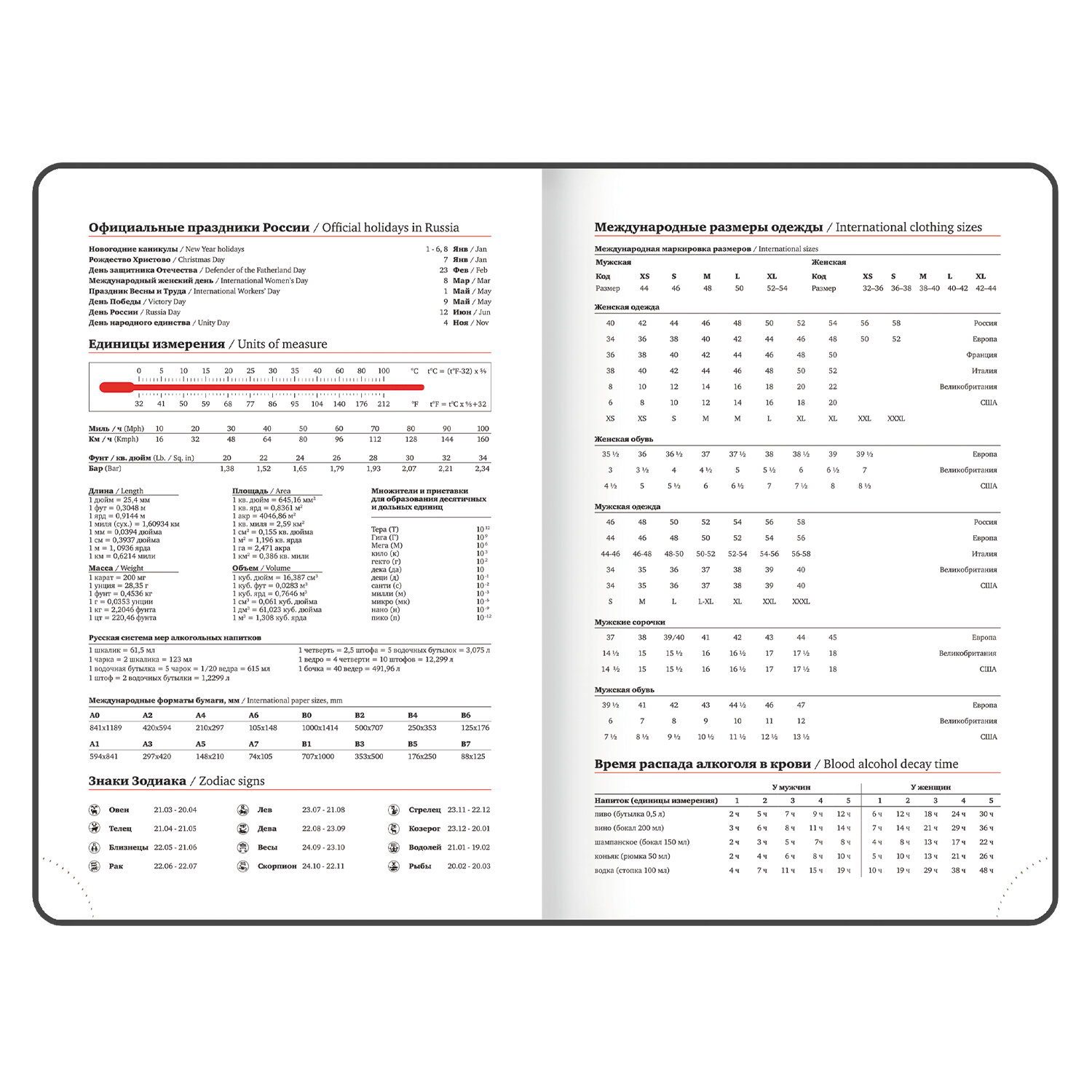 Внутренний блок включает 168 листов белой бумаги плотностью 70 г/м2. Каждая страничка имеет перфорированный угол. Благодаря стандартному формату А5 (138х213 мм) датированный ежедневник удобно использовать как в офисе, так и на выездных деловых встречах. Твердая обложка стилизована под текстурную кожу с шиммером. Подходит для горячего тиснения. Дополнением является закладка-ляссе, с помощью которой при необходимости можно быстро открыть ежедневник на нужной странице. Ежедневник снабжен справочным материалом. В конце есть 4 страницы для записей и заметок.