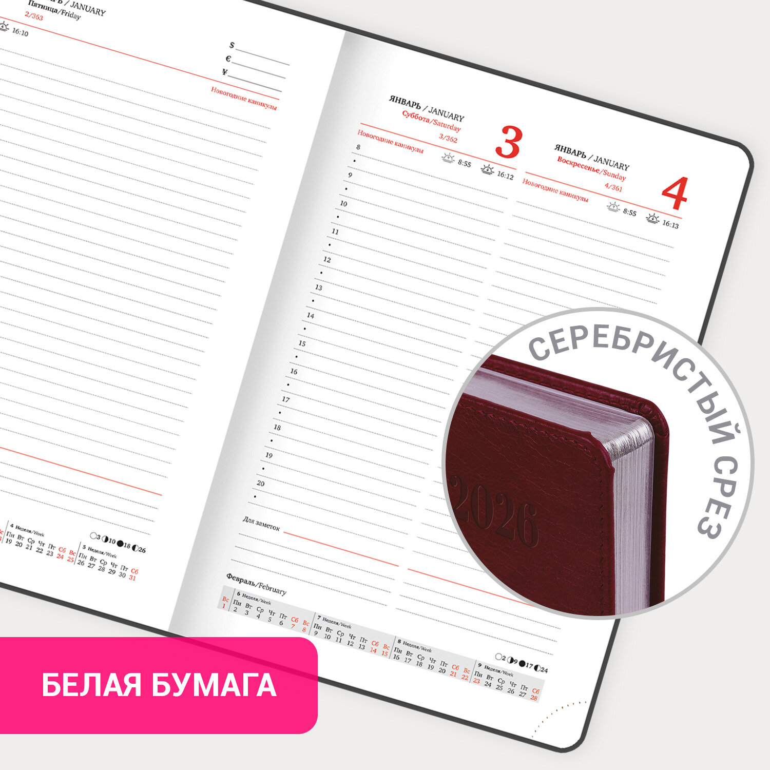 Внутренний блок включает 168 листов белой бумаги плотностью 70 г/м2. Каждая страничка имеет перфорированный угол. Благодаря стандартному формату А5 (138х213 мм) ежедневник удобно использовать как в офисе, так и на выездных деловых встречах. Твердая обложка стилизована под гладкую кожу благородного бордового цвета. Материал обложки подходит для горячего тиснения. Серебряный срез придает ежедневнику особый шарм. Дополнением является закладка-ляссе, с помощью которой при необходимости можно быстро открыть ежедневник на нужной странице. Справочный материал дополнительно расширяет функциональность ежедневника. В конце внутреннего блока есть 4 страницы для записей и заметок.Идеально подойдет для офисных работников и людей, занимающихся бизнесом.