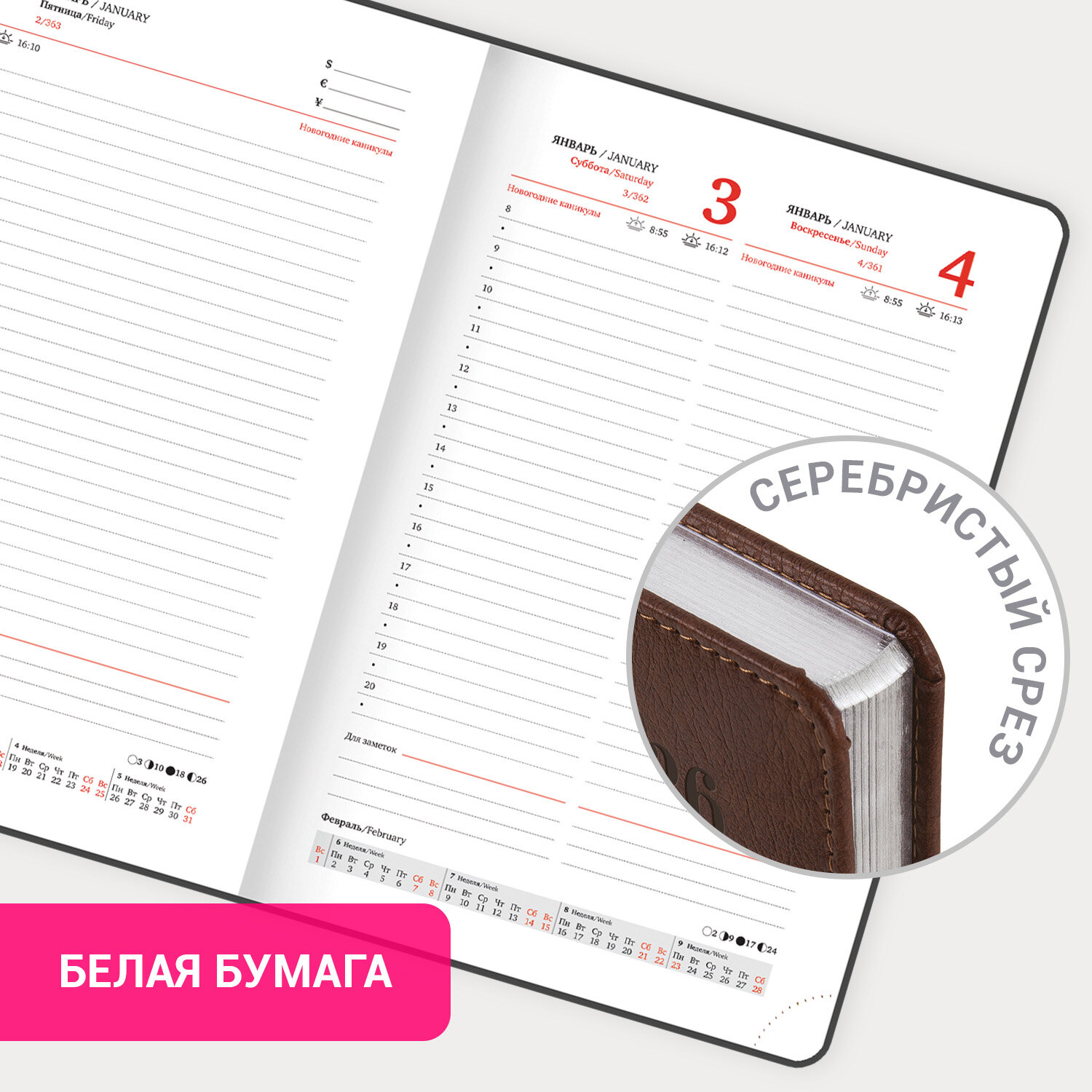 Внутренний блок включает 168 листов белой бумаги плотностью 70 г/м2. Каждая страничка имеет перфорированный угол. Благодаря стандартному формату А5 (138х213 мм) ежедневник удобно использовать как в офисе, так и на выездных деловых встречах. Твердая обложка стилизована под гладкую кожу благородного коричневого цвета. Материал обложки подходит для горячего тиснения. Серебряный срез придает ежедневнику особый шарм. Дополнением является закладка-ляссе, с помощью которой при необходимости можно быстро открыть ежедневник на нужной странице. Справочный материал дополнительно расширяет функциональность ежедневника. В конце внутреннего блока есть 4 страницы для записей и заметок.Идеально подойдет для офисных работников и людей, занимающихся бизнесом.