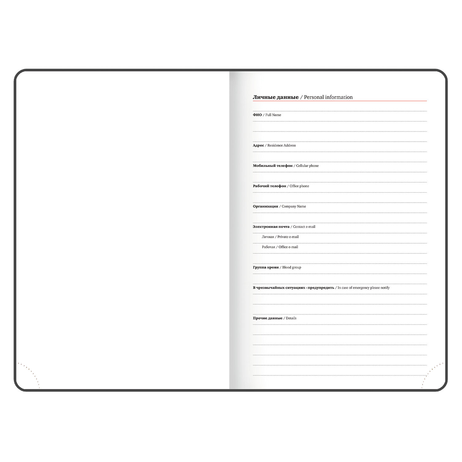 Внутренний блок включает 168 листов белой бумаги плотностью 70 г/м2. Каждая страничка имеет перфорированный угол. Благодаря стандартному формату А5 (138х213 мм) датированный ежедневник удобно использовать как в офисе, так и на выездных деловых встречах. Твердая обложка стилизована под гладкую кожу и имеет интересную деталь в виде тиснения фольгой. Подходит для горячего тиснения. Дополнением является закладка-ляссе, с помощью которой при необходимости можно быстро открыть ежедневник на нужной странице. Ежедневник снабжен справочным материалом. В конце есть 4 страницы для записей и заметок.