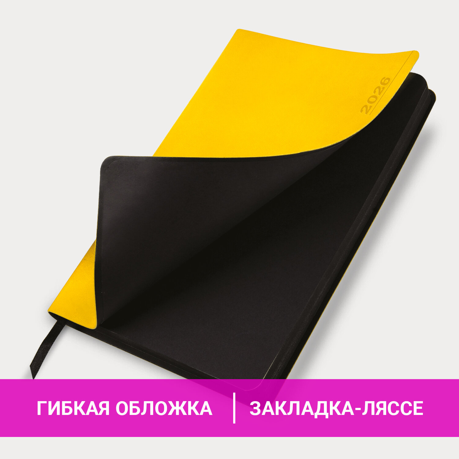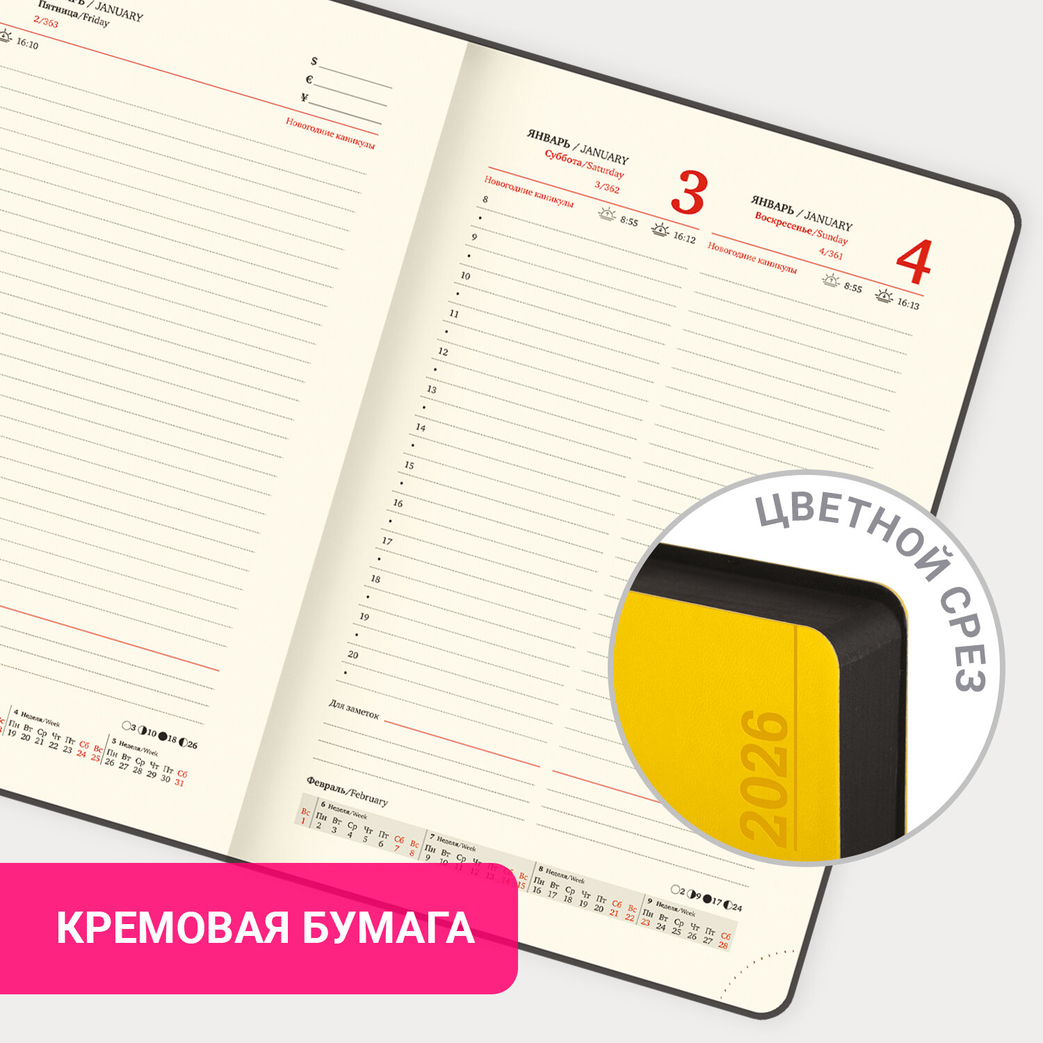 Внутренний блок включает 168 листов кремовой бумаги плотностью 70 г/м2. Каждая страничка имеет перфорированный угол. Благодаря стандартному формату А5 (138х213 мм) ежедневник удобно использовать как в офисе, так и на выездных деловых встречах.Мягкая интегральная обложка стилизована под гладкую кожу неординарного желтого цвета. Материал обложки подходит для горячего тиснения. Срез и форзац ежедневника окрашены в контрастный с обложкой цвет, что придает изделию особый шарм. Дополнением является закладка-ляссе, с помощью которой при необходимости можно быстро открыть ежедневник на нужной странице. Ежедневник снабжен обширным справочным материалом. В конце есть 4 страницы для записей и заметок.Датированный ежедневник BRAUBERG «Metropolis Mix» идеально подойдет для офисных работников и людей, занимающихся бизнесом.