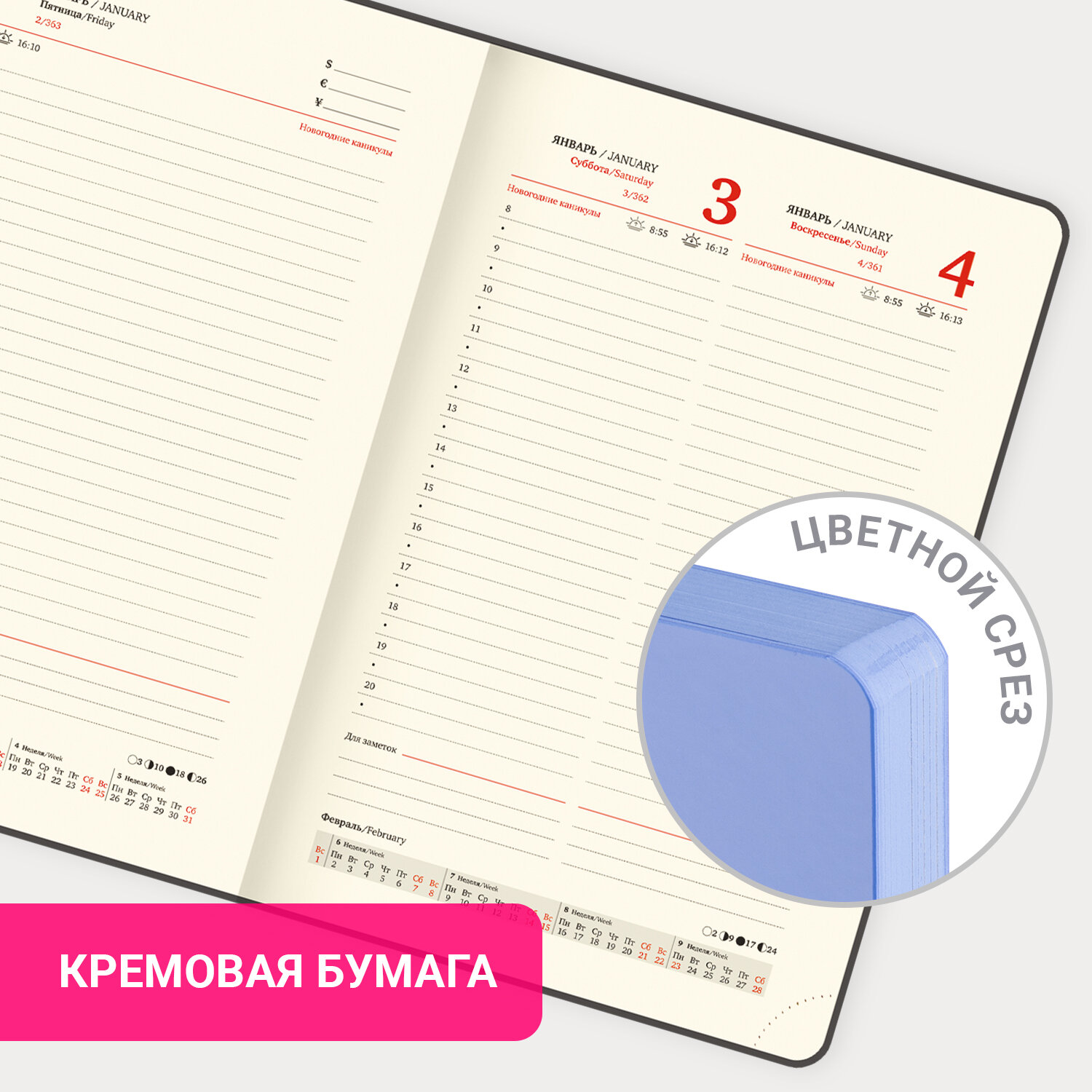 Внутренний блок включает 168 листов кремовой бумаги плотностью 70 г/м2. Каждая страничка имеет перфорированный угол. Благодаря стандартному формату А5 (138х213 мм) ежедневник удобно использовать как в офисе, так и на выездных деловых встречах. Мягкая интегральная обложка пастельного синего цвета стилизована под гладкую кожу. Материал обложки подходит для горячего тиснения. Цветной срез придает ежедневнику особый шарм. Дополнением является закладка-ляссе, с помощью которой при необходимости можно быстро открыть ежедневник на нужной странице. Обширный справочный материал дополнительно расширяет функциональность ежедневника. В конце внутреннего блока есть 4 страницы для записей и заметок.Датированный ежедневник BRAUBERG «Pastel» идеально подойдет для офисных работников, людей, занимающихся бизнесом.