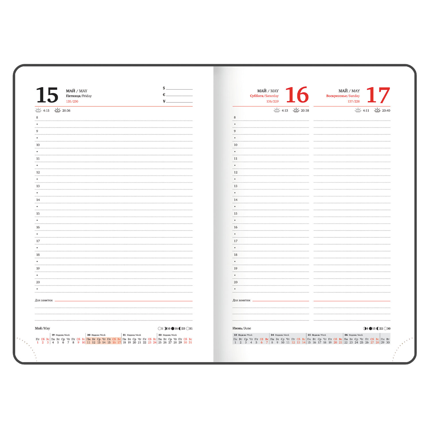 Внутренний блок включает 168 листов белой бумаги плотностью 70 г/м2. Каждая страничка имеет перфорированный угол. Благодаря стандартному формату А5 (138х213 мм) ежедневник удобно использовать как в офисе, так и на выездных деловых встречах. Жесткая книжная обложка насыщенного сапфирового цвета с легкой рельефной фактурой напоминает натуральную кожу. Материал обложки – балакрон, подходит для тиснения только фольгой. Дополнением является закладка-ляссе, с помощью которой при необходимости можно быстро открыть ежедневник на нужной странице. Обширный справочный материал дополнительно расширяет функциональность ежедневника. В конце внутреннего блока есть 4 страницы для записей и заметок.Датированный ежедневник BRAUBERG «Select» идеально подойдет для офисных работников и людей, занимающихся бизнесом.