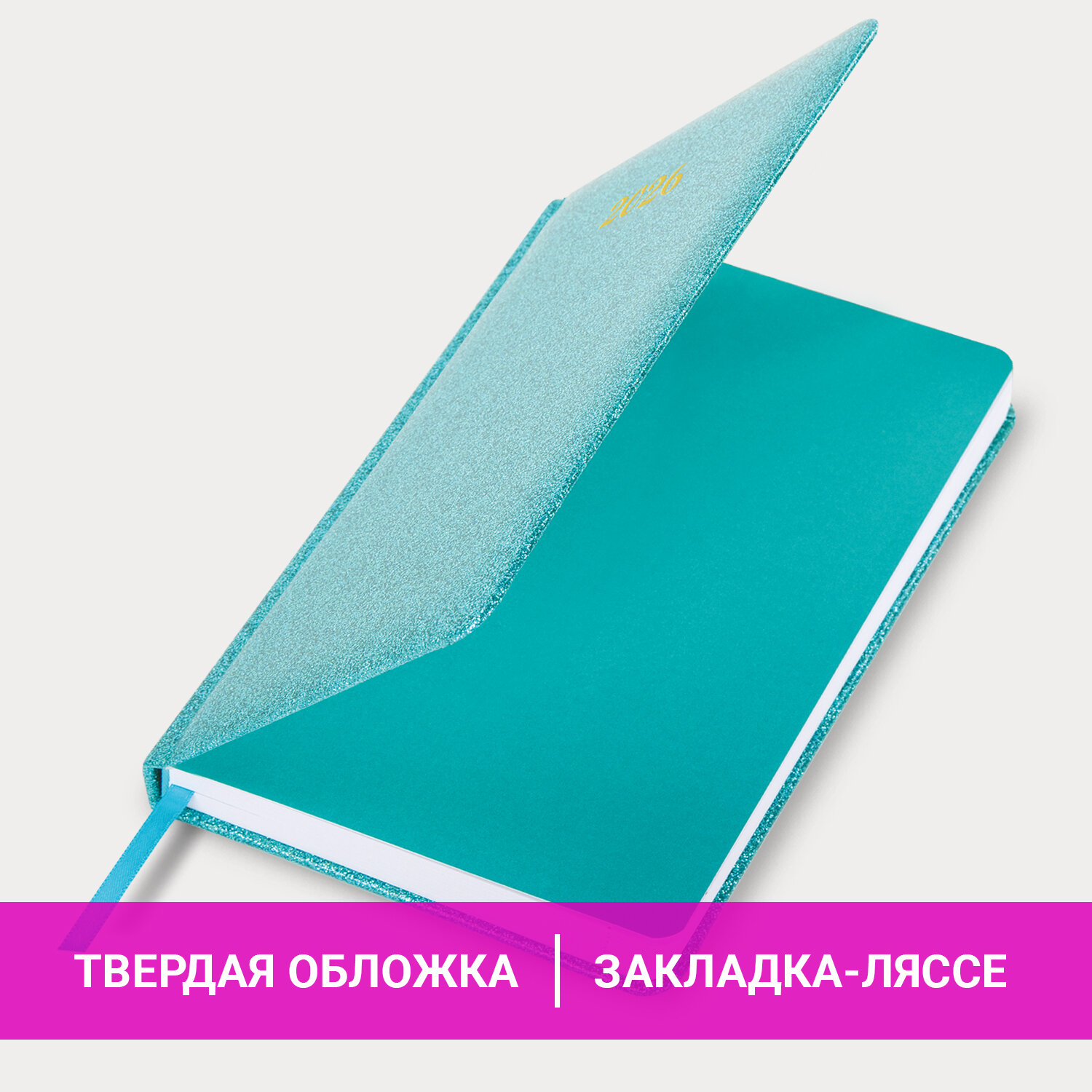 Внутренний блок включает 168 листов белой бумаги плотностью 70 г/м2. Каждая страничка имеет перфорированный угол. Благодаря стандартному формату А5 (138х213 мм) ежедневник удобно использовать как в офисе, так и на выездных деловых встречах. Твердая обложка стилизована под кожу с глиттером неординарного бирюзового цвета. Подходит для тиснения фольгой. Дополнением является закладка-ляссе, с помощью которой при необходимости можно быстро открыть ежедневник на нужной странице. Справочный материал дополнительно расширяет функциональность ежедневника. В конце внутреннего блока есть 4 страницы для записей и заметок.Датированный ежедневник BRAUBERG «Sparkle» идеально подойдет для офисных работников и людей, занимающихся бизнесом.