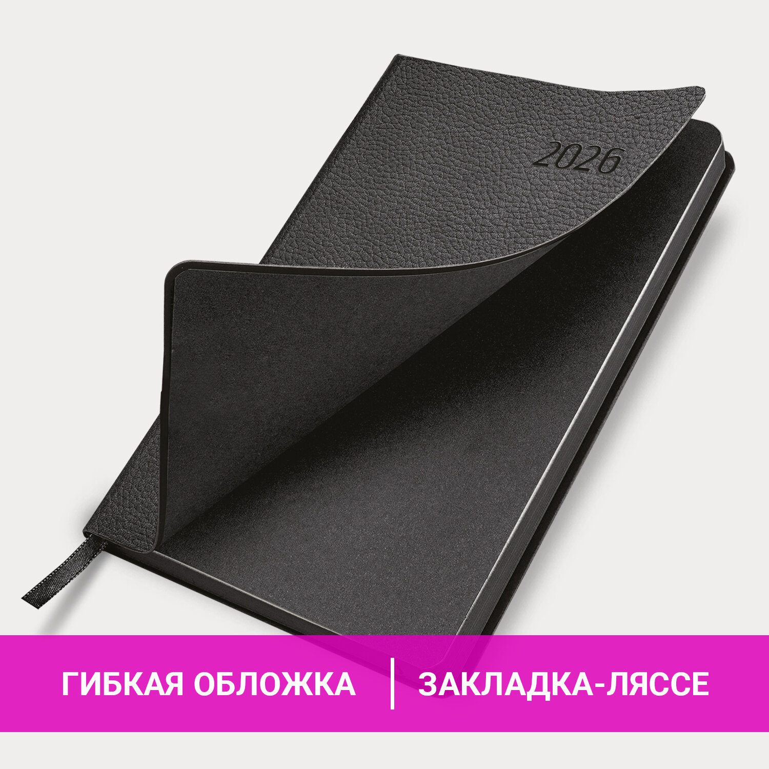 Внутренний блок включает 168 листов тонированной бумаги плотностью 70 г/м2. Каждая страничка имеет перфорированный угол. Благодаря стандартному формату А5 (138х213 мм) ежедневник удобно использовать как в офисе, так и на выездных деловых встречах. Мягкая (интегральная) обложка стилизована под фактурную кожу строгого черного цвета. Подходит для горячего тиснения. Дополнением является закладка-ляссе, с помощью которой при необходимости можно быстро открыть ежедневник на нужной странице. Ежедневник снабжен справочным материалом. В конце есть 4 страницы для записей и заметок.Датированный ежедневник BRAUBERG «Stylish» идеально подойдет для офисных работников и людей, занимающихся бизнесом.