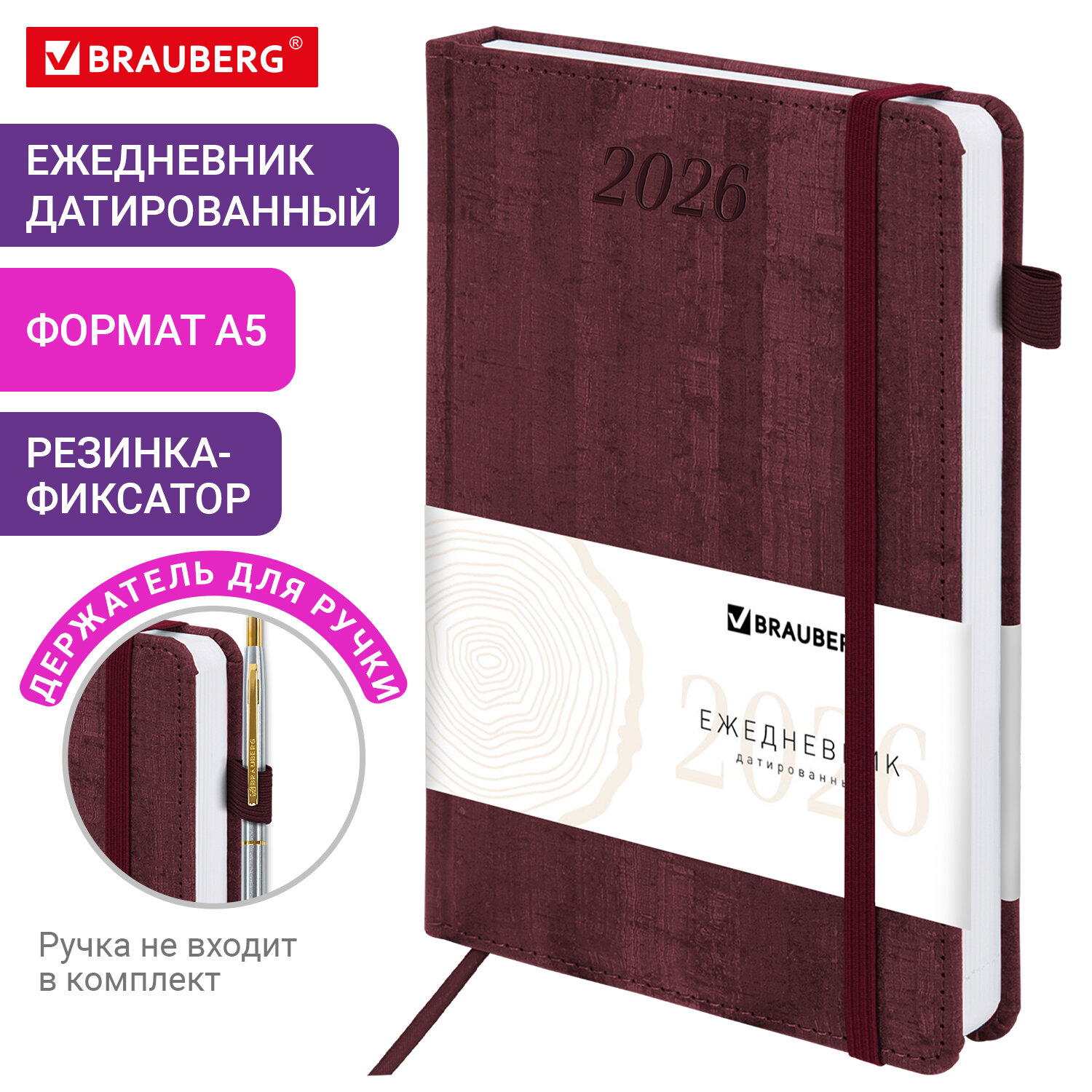 Ежедневник датированный 2026 А5 138×213 мм, BRAUBERG «Wood», под кожу, держатель для ручки, бордо, 117107