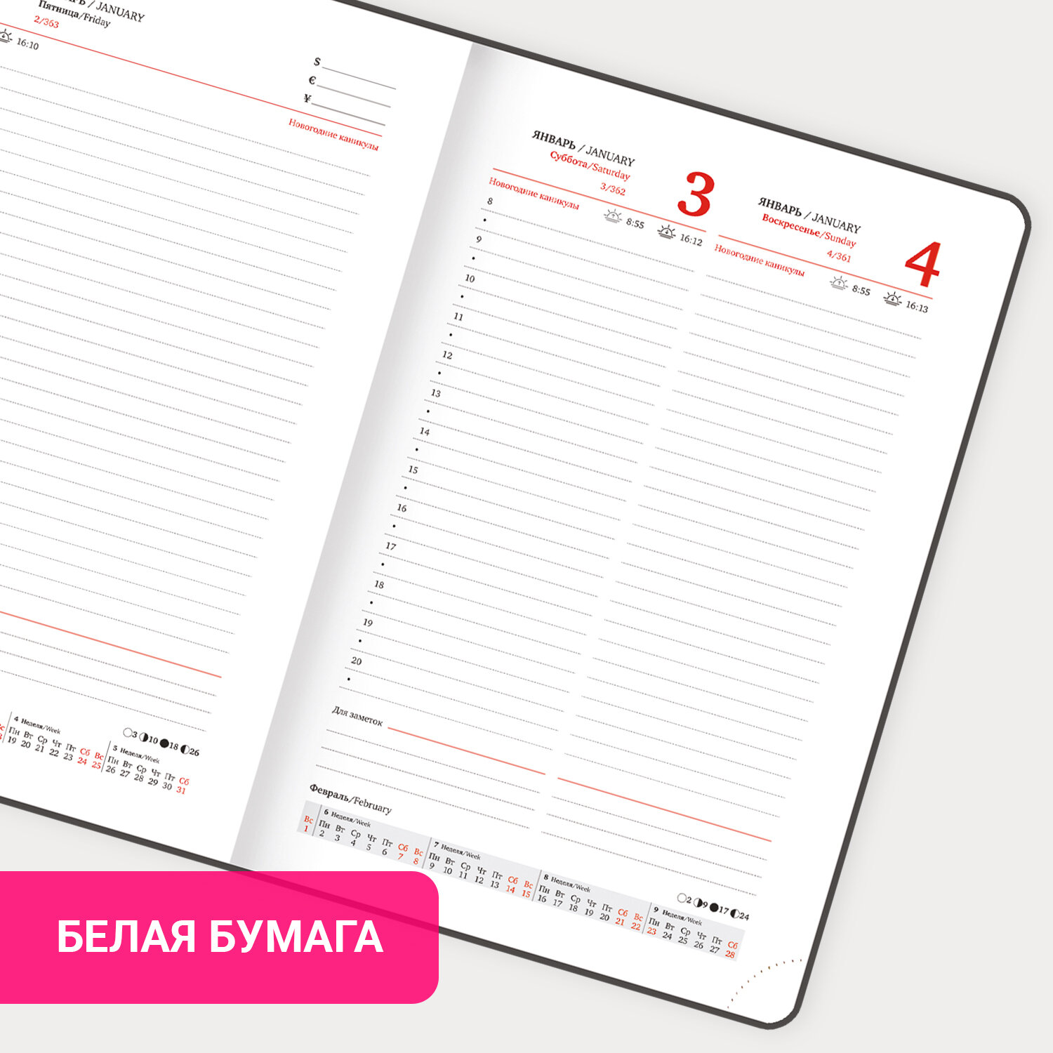 Внутренний блок включает 168 листов белой бумаги плотностью 70 г/м2. Каждая страничка имеет перфорированный угол. Благодаря стандартному формату А5 (138х213 мм) ежедневник удобно использовать как в офисе, так и на выездных деловых встречах. Твердая обложка стилизована под благородное дерево и выполнена в благородном зеленом цвете. Подходит для горячего тиснения. Снабжен резинкой-фиксатором, благодаря чему ежедневник не откроется в сумке или портфеле. Дополнениями являются закладка-ляссе, с помощью которой при необходимости можно быстро открыть ежедневник на нужной странице, и держатель для ручки. Ежедневник снабжен справочным материалом. В конце есть 4 страницы для записей и заметок.