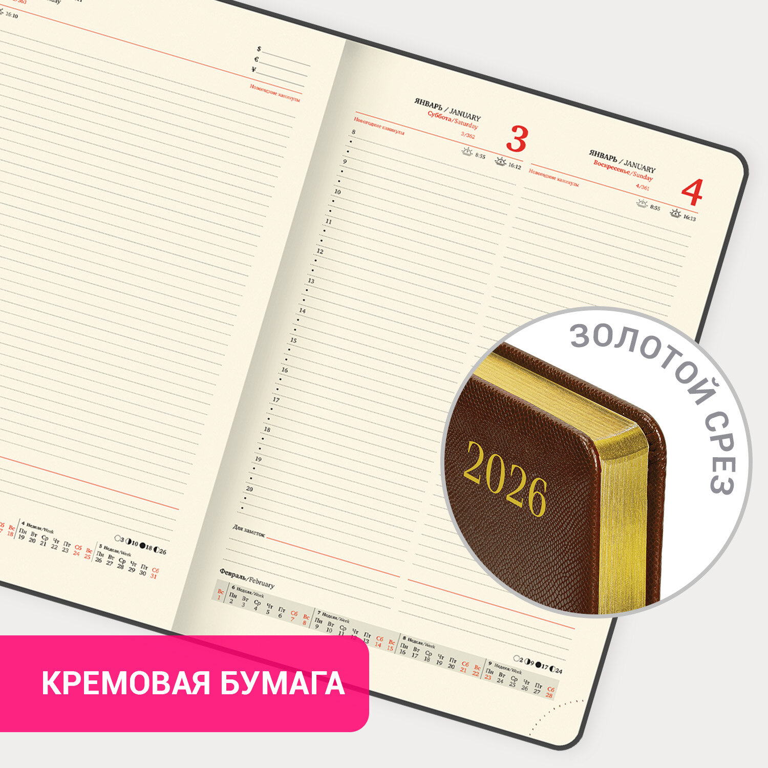 Ежедневник датированный 2026 БОЛЬШОЙ ФОРМАТ 210х297 мм, А4, BRAUBERG «Iguana», под кожу, коричневый, 117244