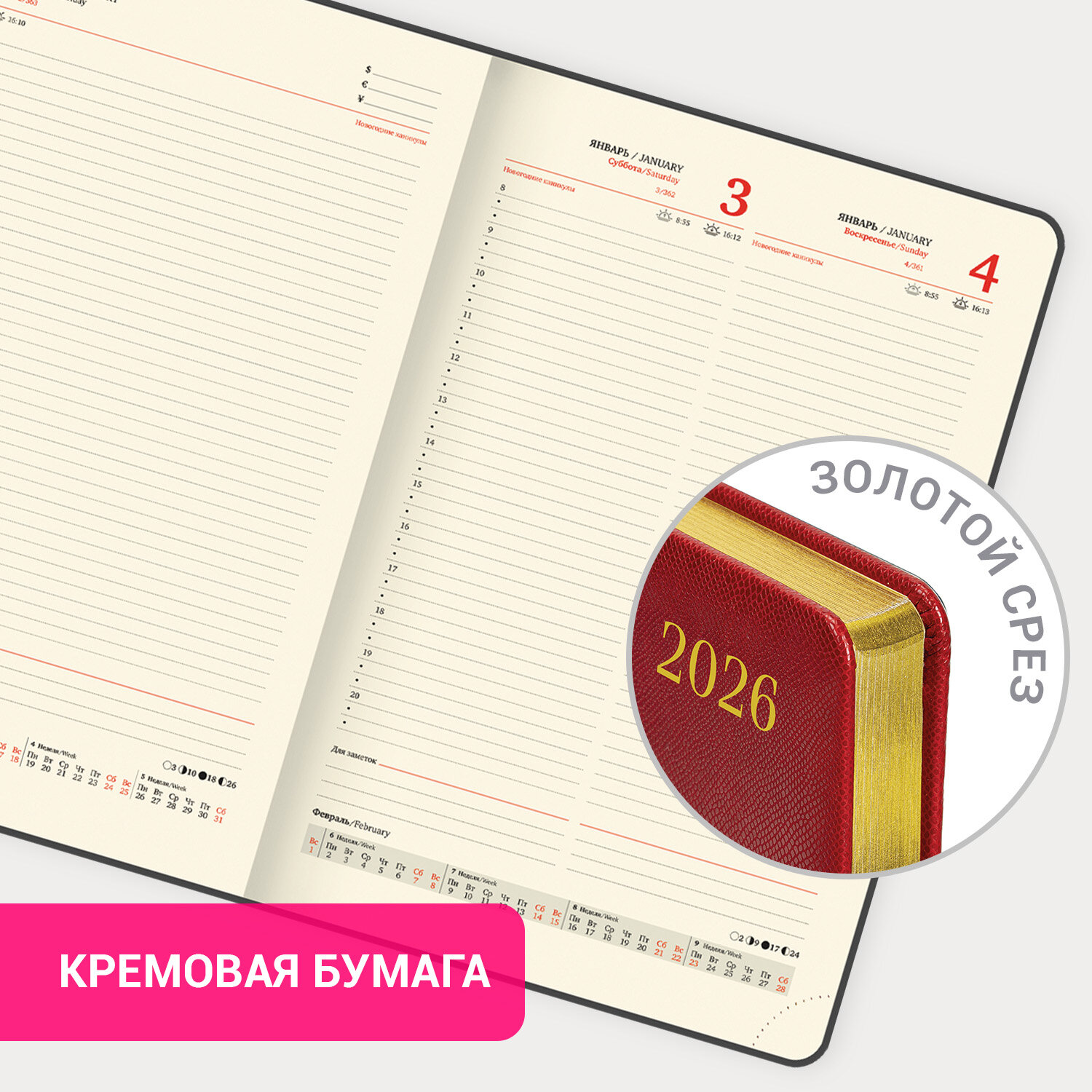 Ежедневник датированный 2026 БОЛЬШОЙ ФОРМАТ 210х297 мм, А4, BRAUBERG «Iguana», под кожу, красный, 117246