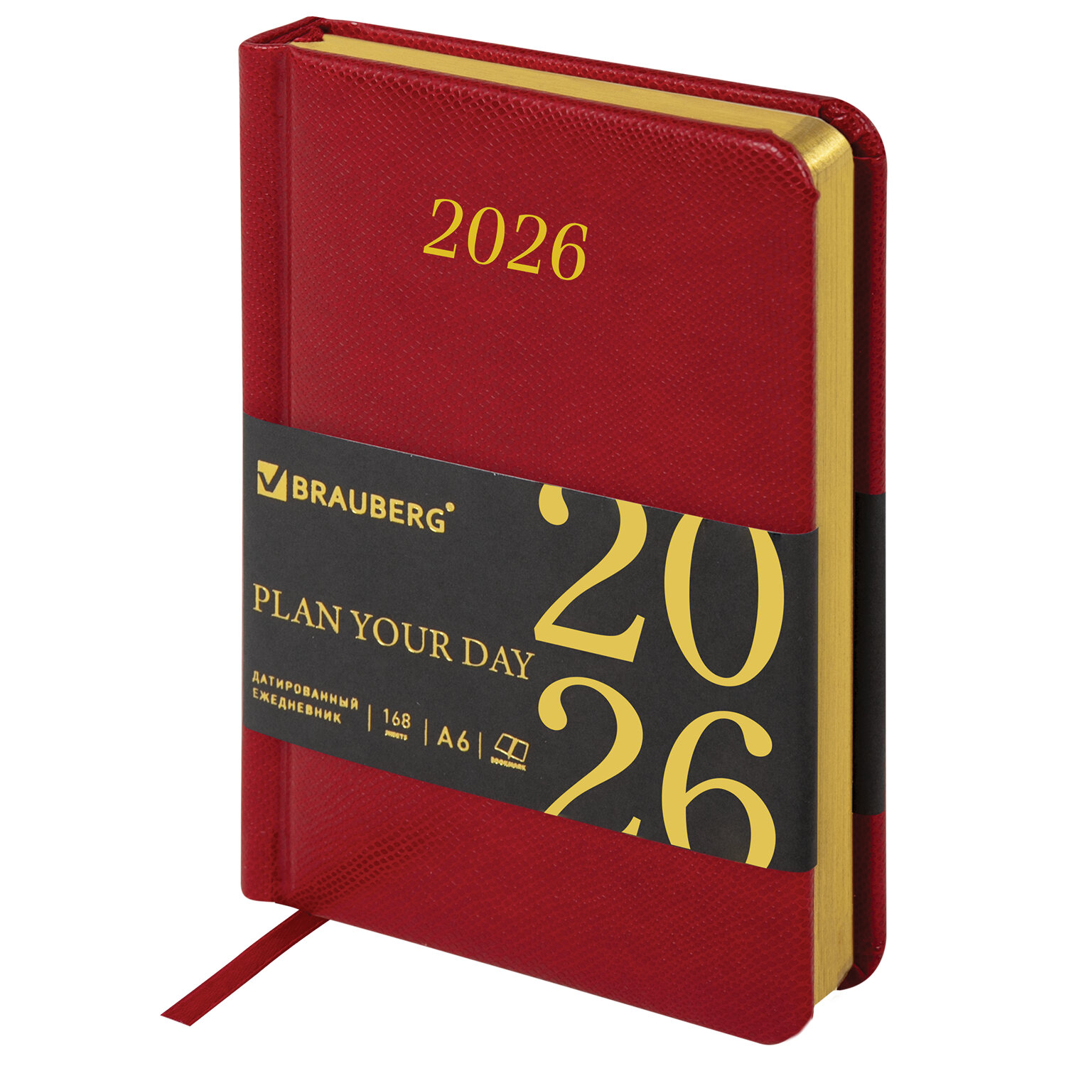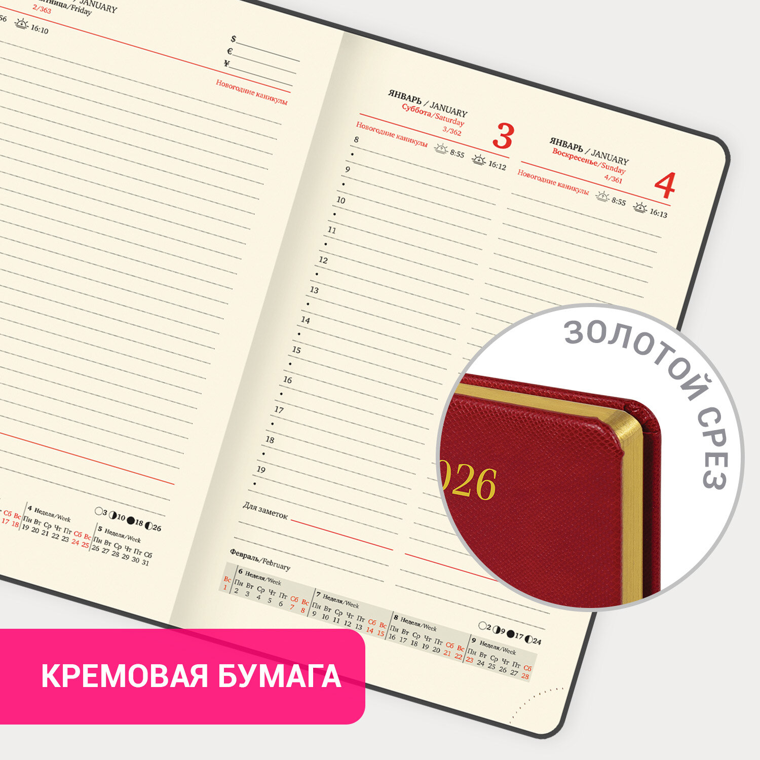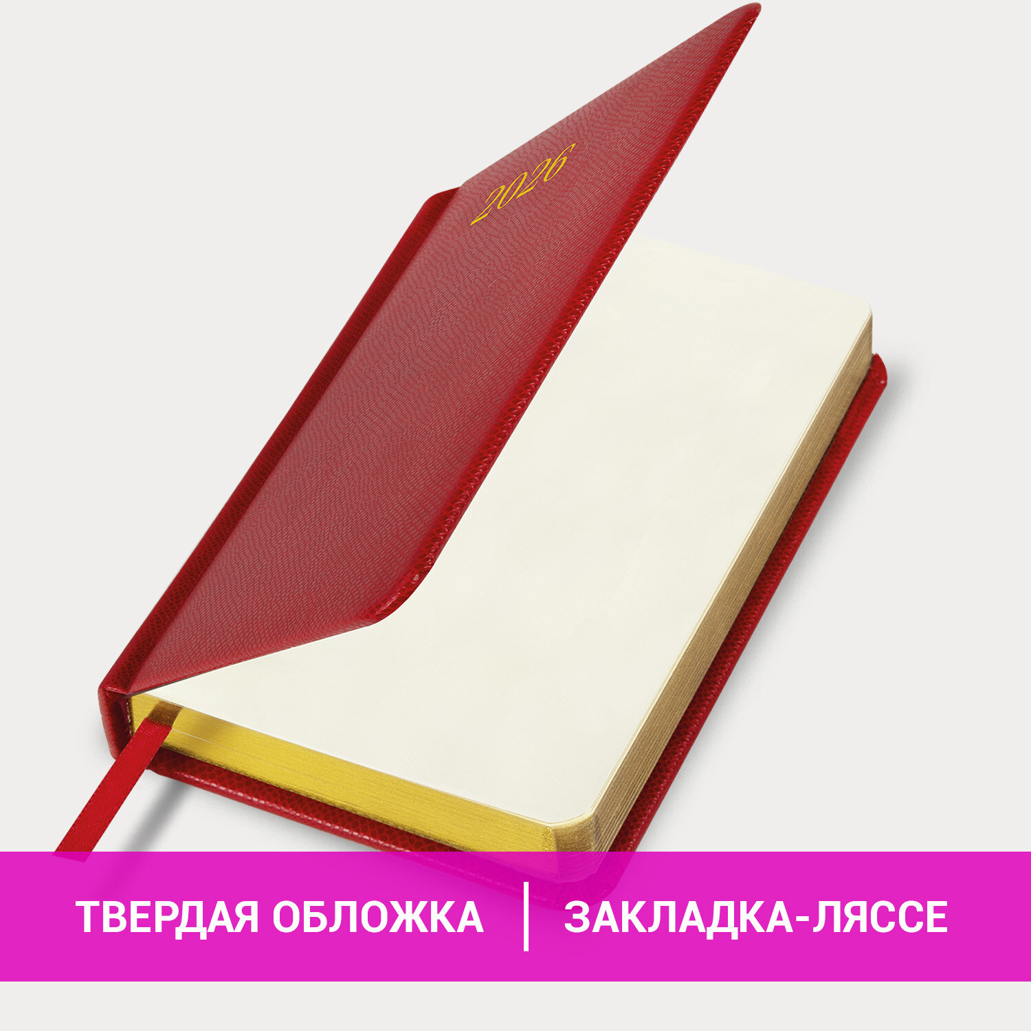 Ежедневник датированный 2026, МАЛЫЙ ФОРМАТ 100х150 мм, А6, BRAUBERG «Iguana», под кожу, красный, 117251