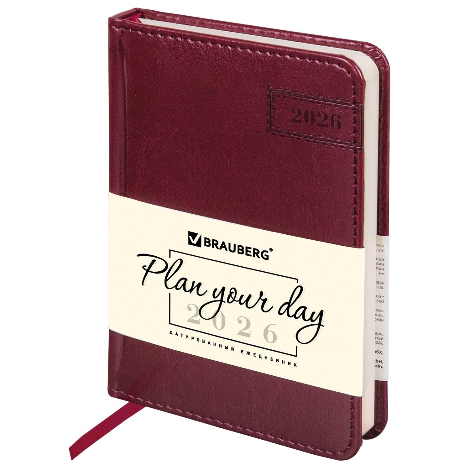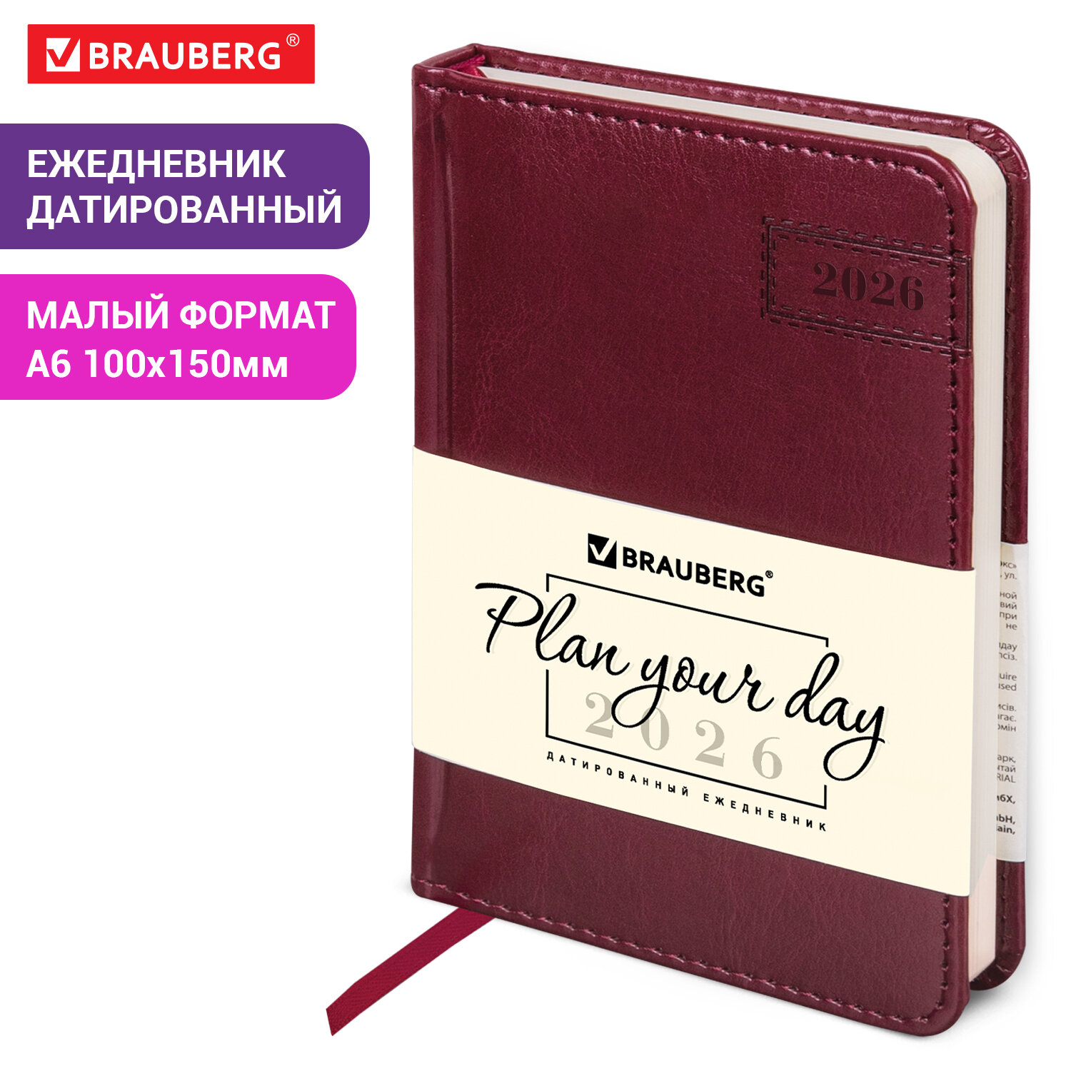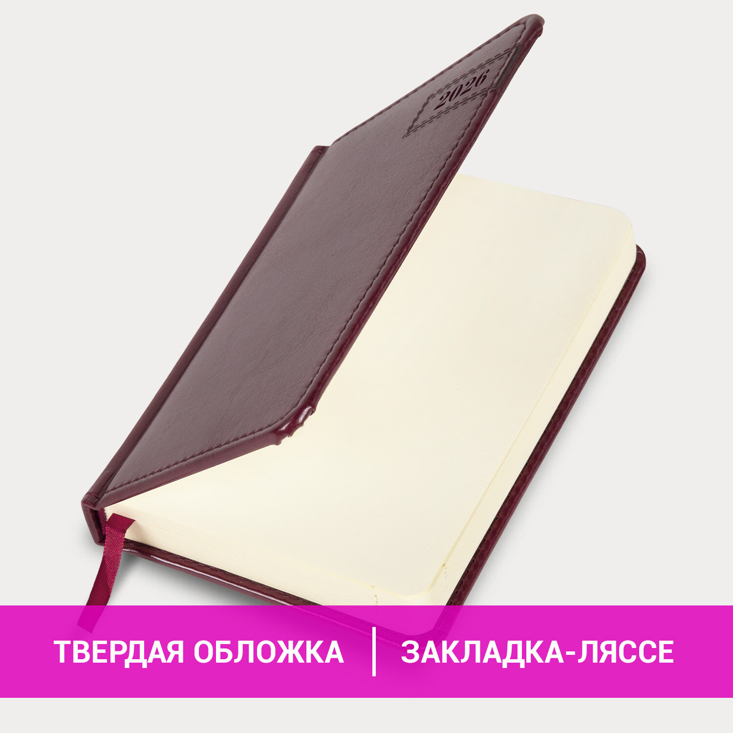 Ежедневник датированный 2026, МАЛЫЙ ФОРМАТ 100х150 мм, А6, BRAUBERG «Imperial», под кожу, бордо, 117254