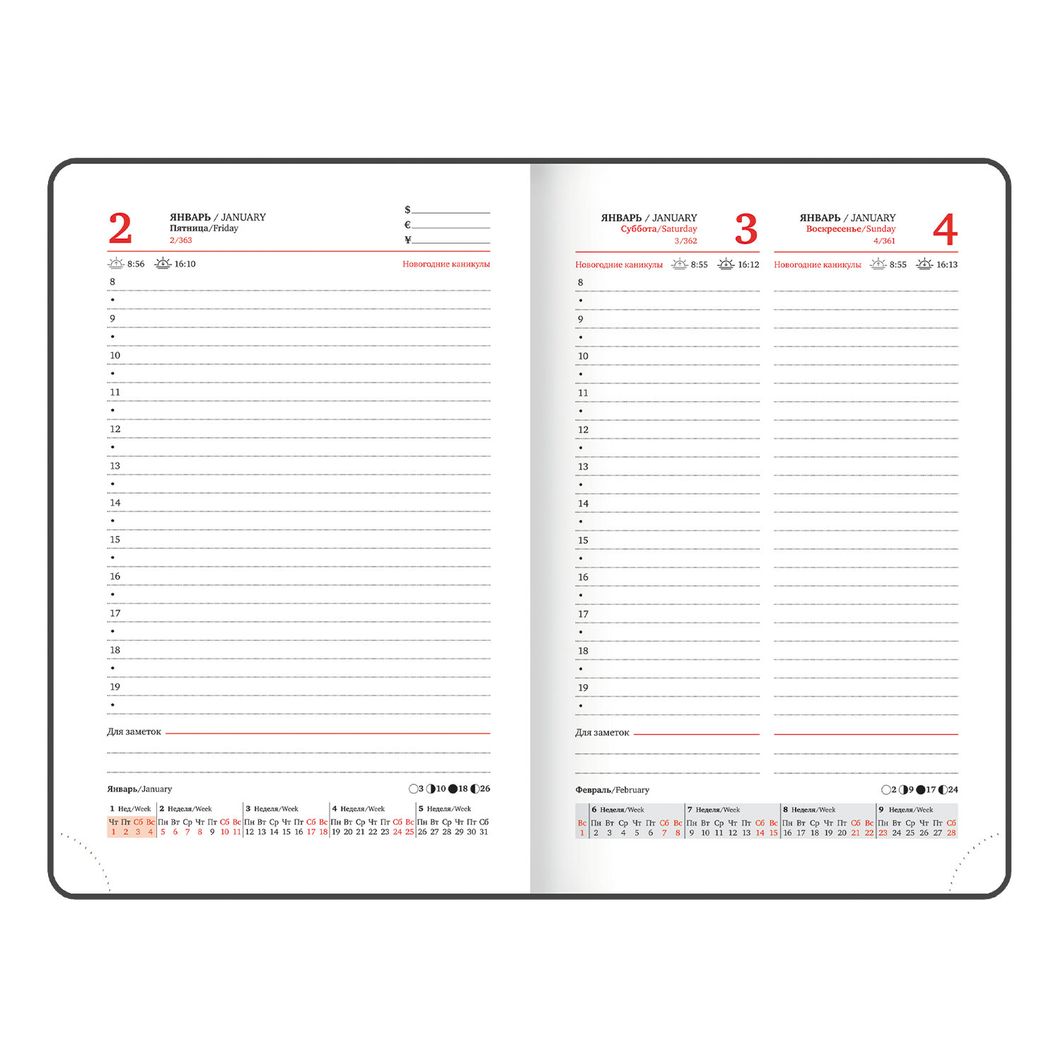 Внутренний блок включает 168 листов белой бумаги плотностью 70 г/м2. Каждая страничка имеет перфорированный угол. Благодаря малому формату А6 (100х150 мм) ежедневник удобно использовать как в офисе, так и на выездных деловых встречах. Твердая обложка черного цвета стилизована под гладкую кожу. Подходит для горячего тиснения. Срез и форзац ежедневника окрашены на контрасте с цветом обложки, что придает ему особый шарм.Дополнением является закладка-ляссе, с помощью которой при необходимости можно быстро открыть ежедневник на нужной странице. Обширный справочный материал расширяет функциональность ежедневника. В конце внутреннего блока есть 4 страницы для записей и заметок.Датированный ежедневник BRAUBERG «Rainbow» идеально подойдет для офисных работников и людей, занимающихся бизнесом, ценящих свое драгоценное время.