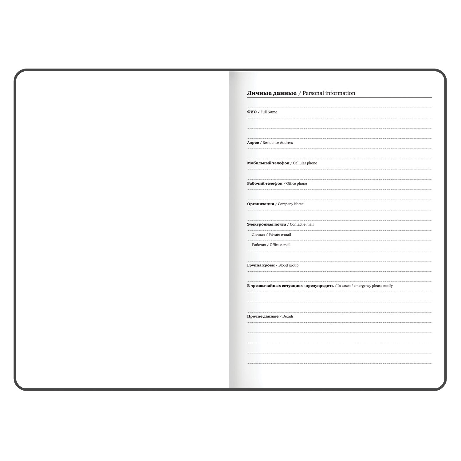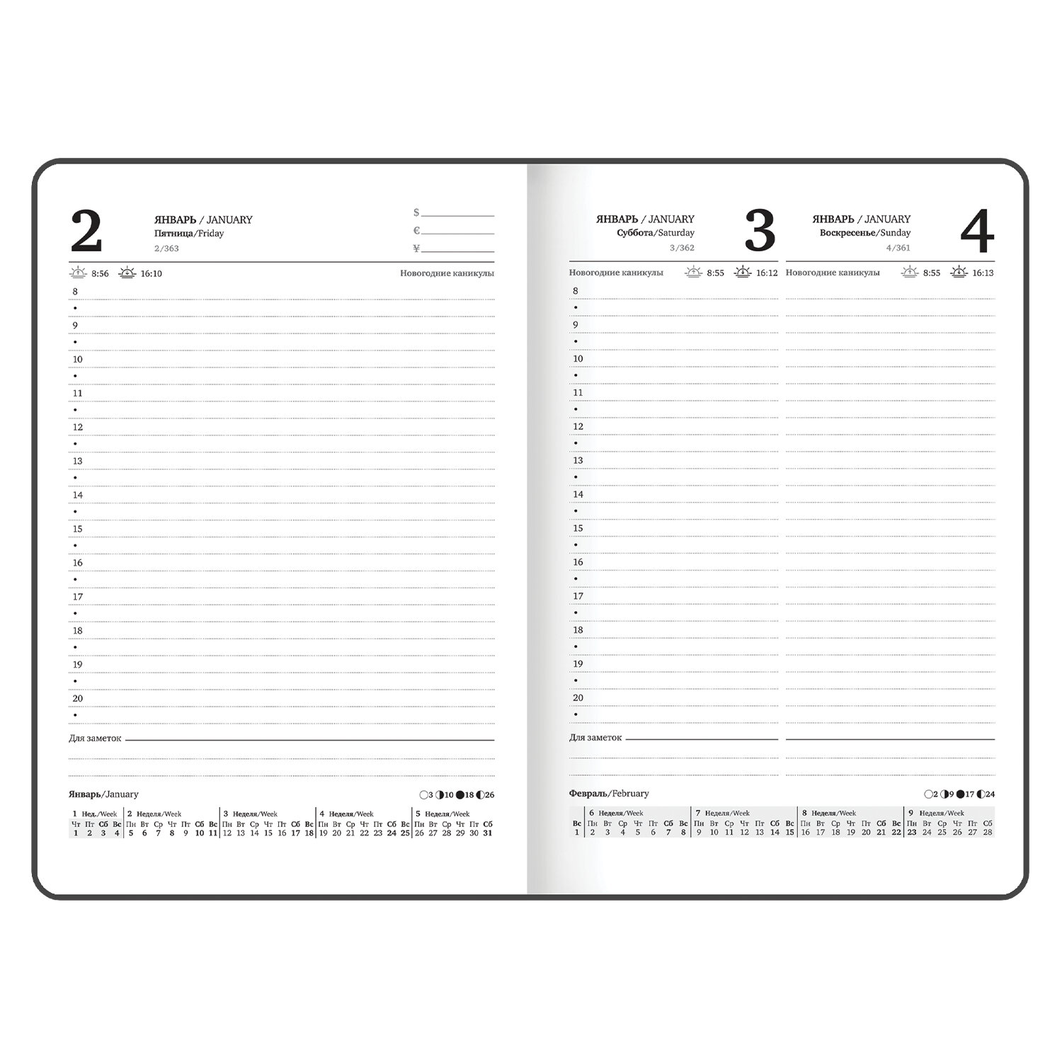 Внутренний блок состоит из 160 листов офсетной бумаги плотностью 60 г/м2. Обложка 7БЦ (твердый переплет с матовой пленкой) обеспечивает долговечность при активном использовании. Благодаря стандартному формату А5 (145х203 мм) датированный ежедневник удобно использовать как в офисе, так и на выездных деловых встречах. Резинка-фиксатор надежно защищает от случайного раскрытия в сумке или портфеле. Печать внутреннего блока – в одну краску. Ежедневник снабжен справочным материалом.