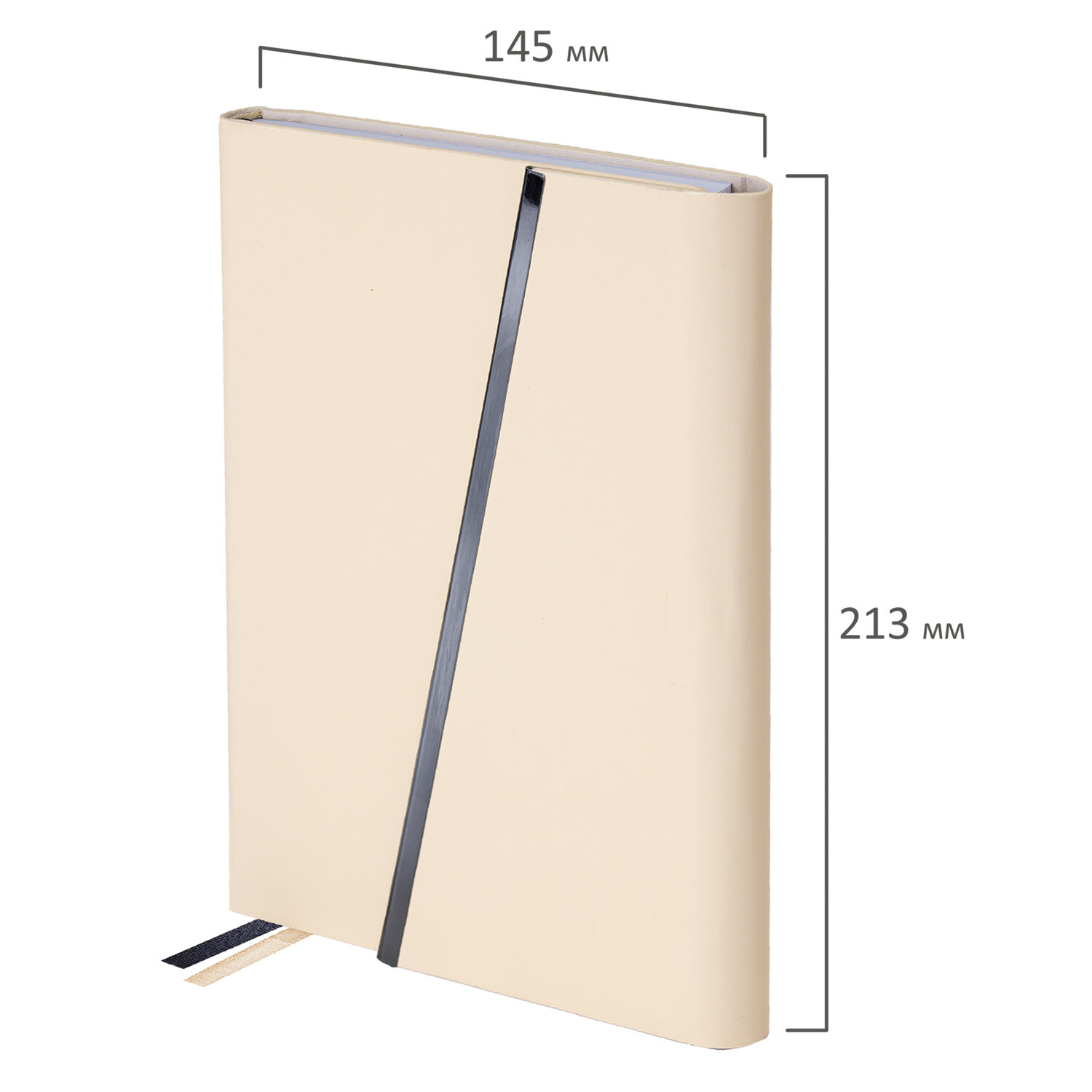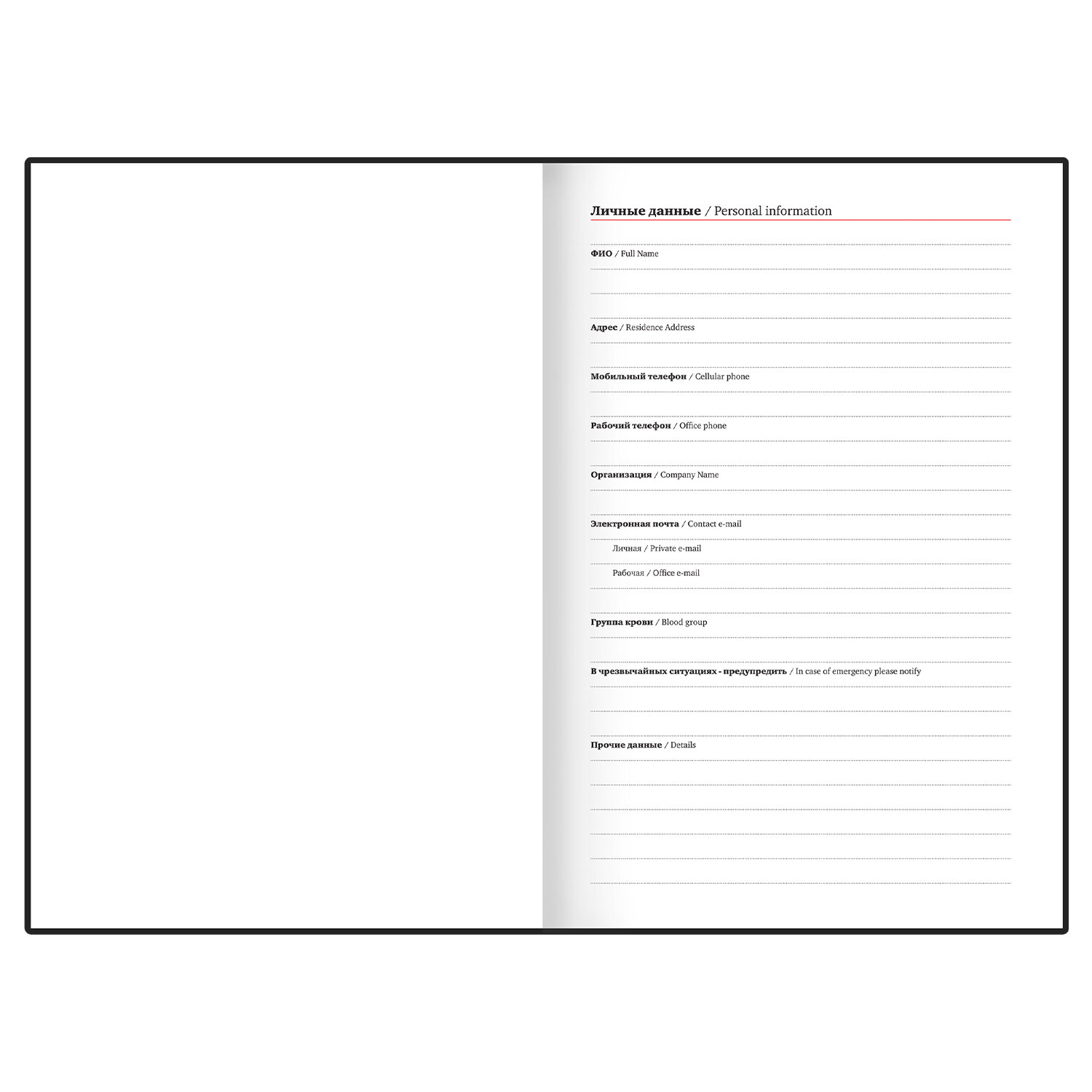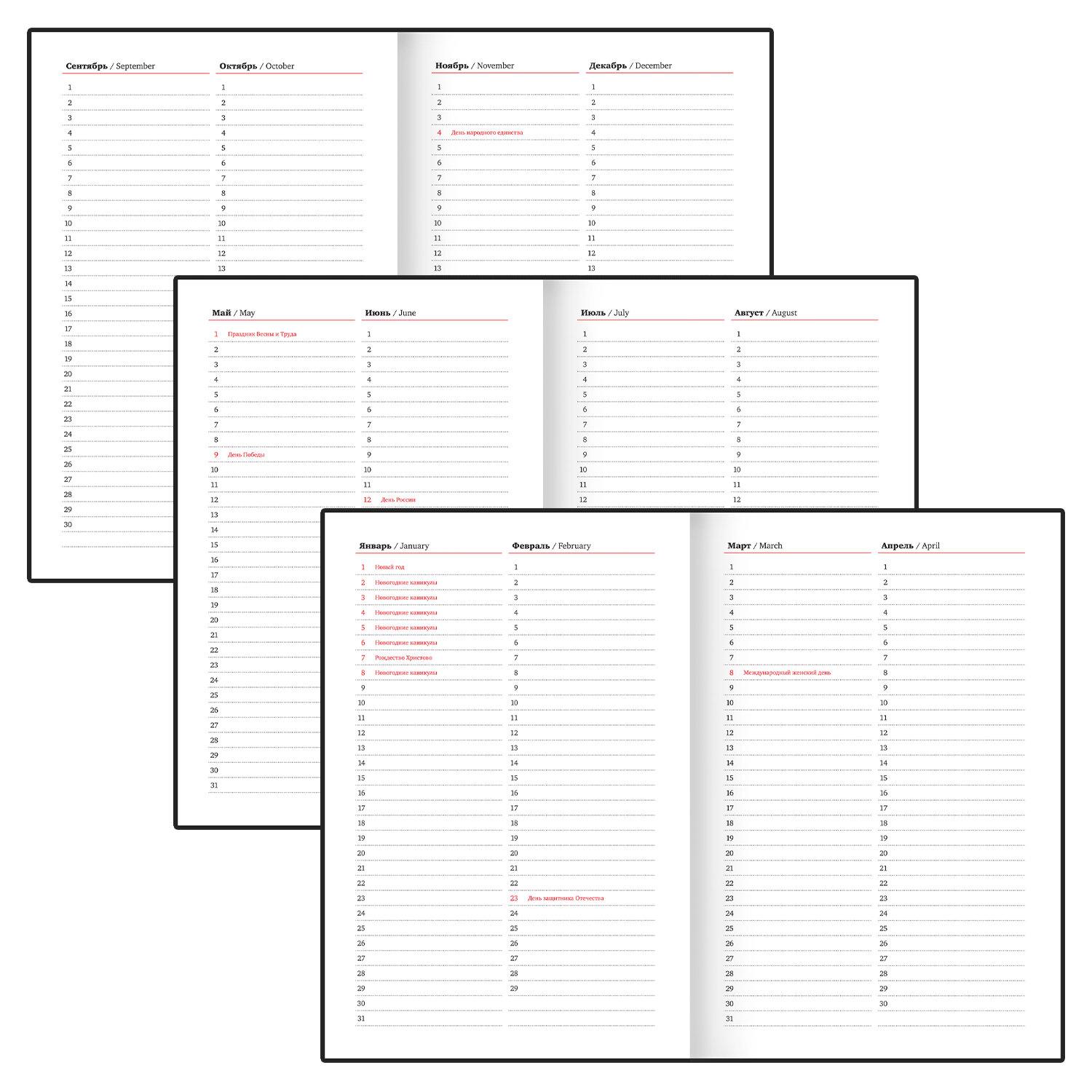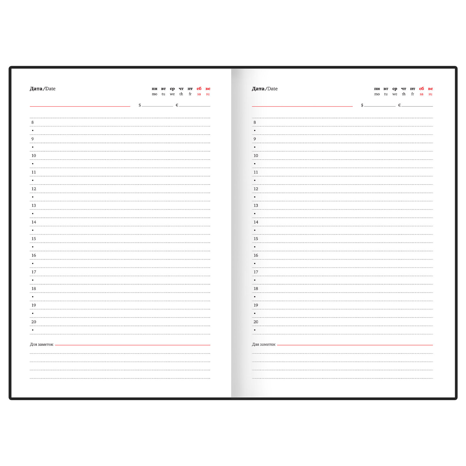 Внутренний блок включает 160 листов белой бумаги плотностью 70 г/м2. Каждая страничка имеет перфорированный угол. Благодаря стандартному формату А5 (145х213мм) ежедневник удобно использовать как в офисе, так и на выездных деловых встречах. Твердая обложка стилизована под гладкую кожу и имеет стильный магнитный клапан, благодаря чему он не откроется в сумочке или портфеле, и листы не помнутся. Материал обложки подходит для горячего тиснения. Дополнениями являются две закладки-ляссе, с помощью которых при необходимости можно быстро открыть ежедневник на нужной странице. Справочный материал дополнительно расширяет функциональность ежедневника. В конце внутреннего блока есть 7 страниц для записей и заметок.